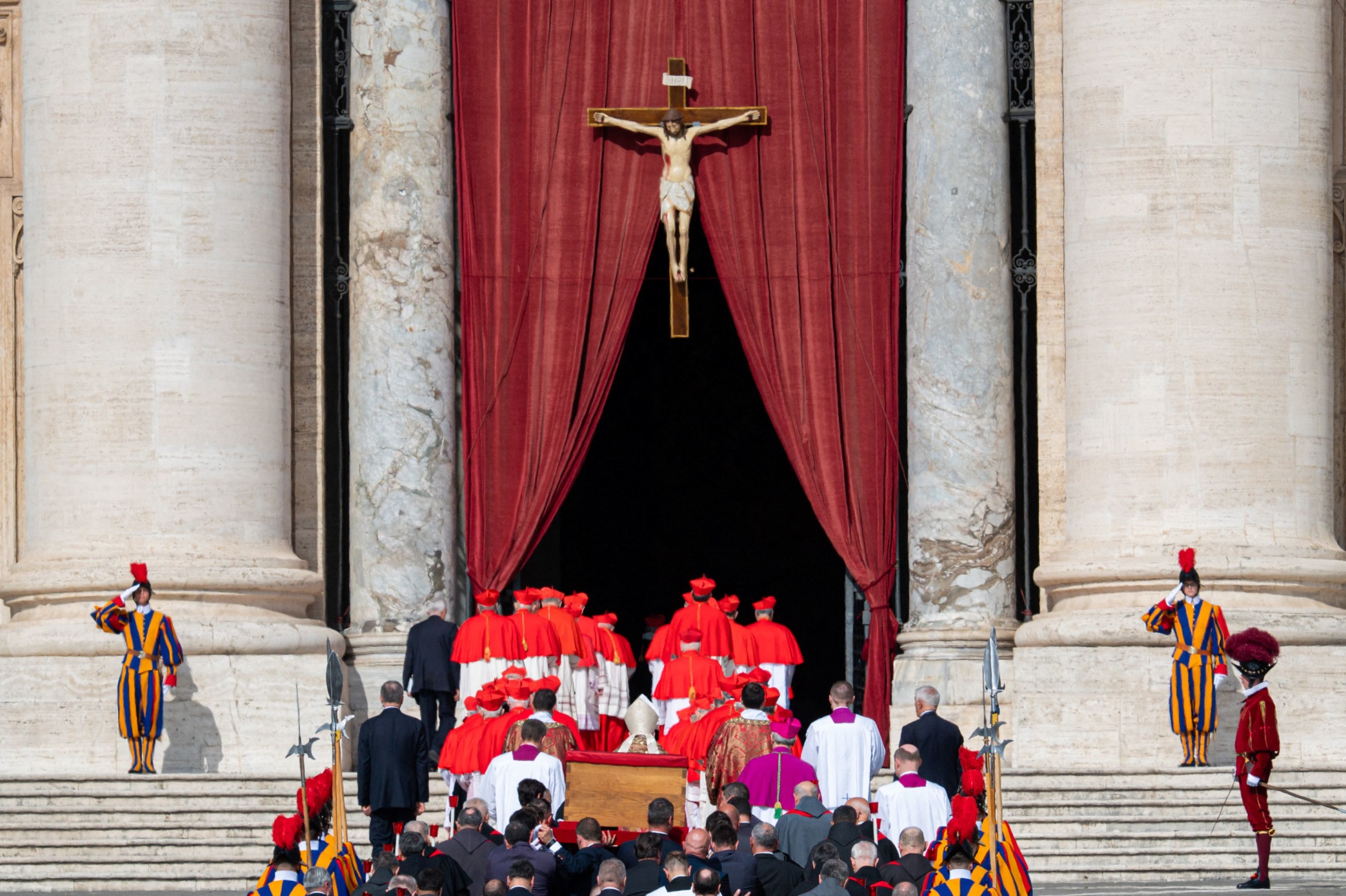 Ferenc pápa koporsója szerdától a Casa Santa kápolnából a Szent Péter bazilikába került át, itt tekinthető meg. Ezen a napon reggel 9-től Kevin Joseph Farrell bíboros kamarás vezetett szertartást a helyszínen, ami imaórával kezdődött és körmenettel folytatódott. Ahogy a Szentszéki Sajtóiroda előzetesen közölte, a körmenet a Santa Marta téren és a Piazza dei Protomartiri Romani téren haladt keresztül. A körmenet ezután a Harangok boltozatán keresztül érkezett a Szent Péter térre, és a központi ajtón keresztül lépett be a bazilikába. Itt a gyóntatóoltárnál Farrell bíboros vezette az Ige liturgiáját, melynek végétől kezdve látogatható a pápa koporsója.