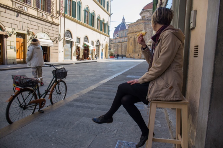 Aztán amikor kiszabadultunk, élő bejelentkezéseket tettem a Facebookon, megmutattam a helyeket, ahol jártunk, vagy biciklis városnézésre „invitáltam” a követőket: betettem a kerékpár kosarába a telefonomat, és körbetekertem a várost. Így otthonról nézegethették Firenze belvárosát, ugyan a köveken rázkódott a kosár, és vele együtt a mobil is, de talán éppen ezért volt élvezhető a közvetítés.