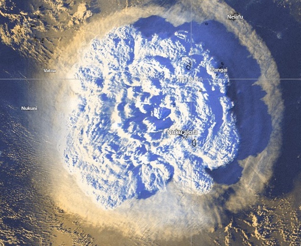 Satellite images captured the moment a giant underwater volcano erupted near Tonga, causing a tsunami