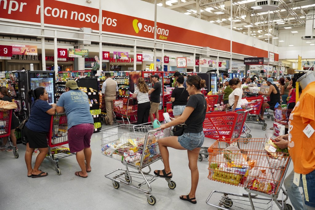 Az emberek élelmiszert és tartós élelmiszereket vásárolnak egy szupermarketben a Beryl hurrikán érkezésére készülve a mexikói Quintana Roo állam Cancun turistavárosában Fotó: Elizabeth RUIZ / AFP