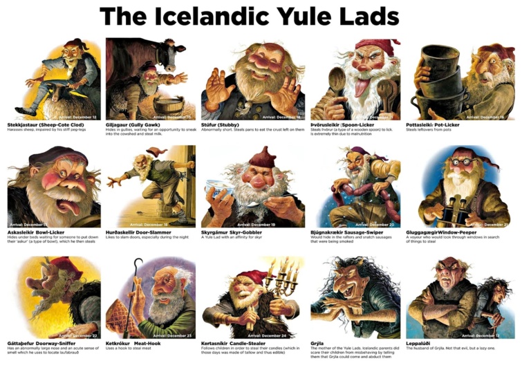 Egészen pontosan tizenhárom troll jön le a hegyekből, izlandi nevükön “Jólasveinar”, és nem egyetlen éjszaka, hanem december 12. és 24. között éjszakánként egy.