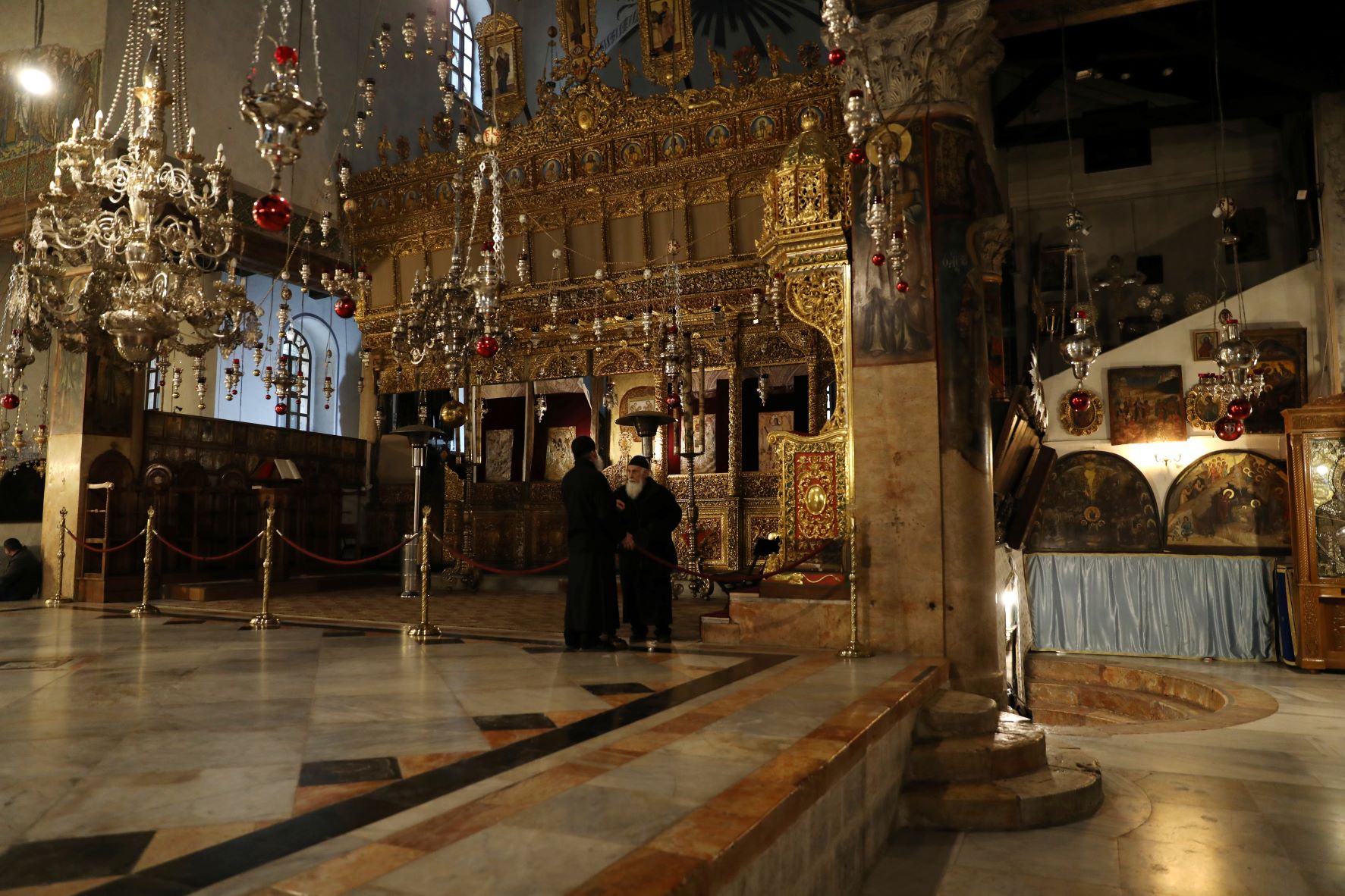 A betlehemi Születés templomában szerzetesek 2021. december 23-án. A bazilika altemploma azon a helyen, abban a barlangban épült, ahol a keresztények hite szerint Jézus megszületett. Fotó: MTI/EPA