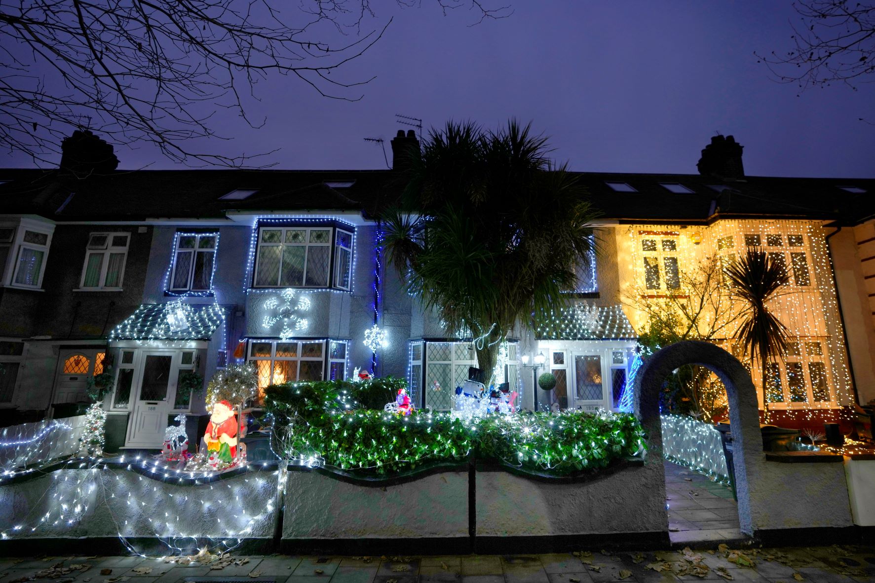Karácsonyra feldíszített házak Londonban 2021. december 23-án. A brit kormány közölte, az ünnep befejeződéséig nem vezet be újabb korlátozásokat a koronavírus-járvány miatt. Fotó: MTI/AP/Kirsty Wigglesworth