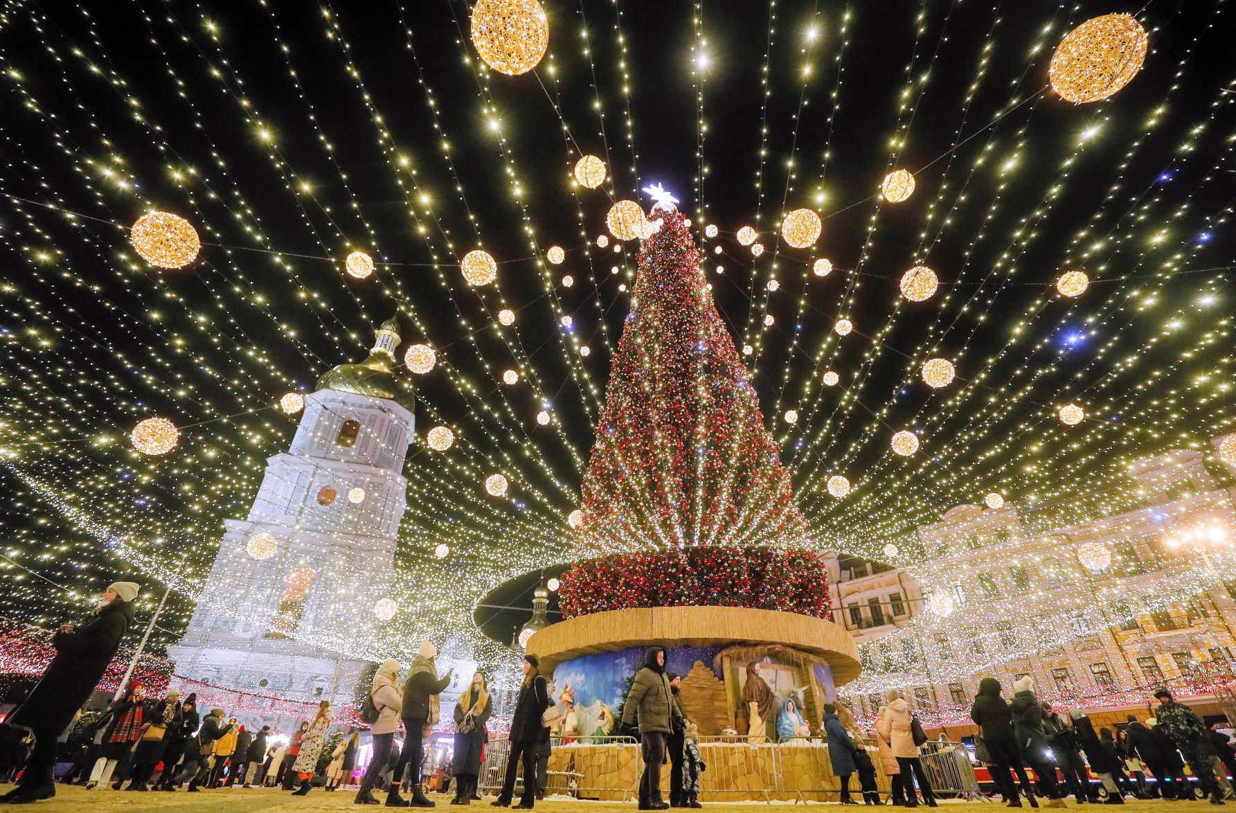 Karácsonyfa a kijevi Szent Zsófia-székesegyház előtt 2021. december 23-án. A 31 méter magas fán több mint tízezer díszt helyeztek el. Fotó: MTI/EPA/Szerhij Dolzsenko