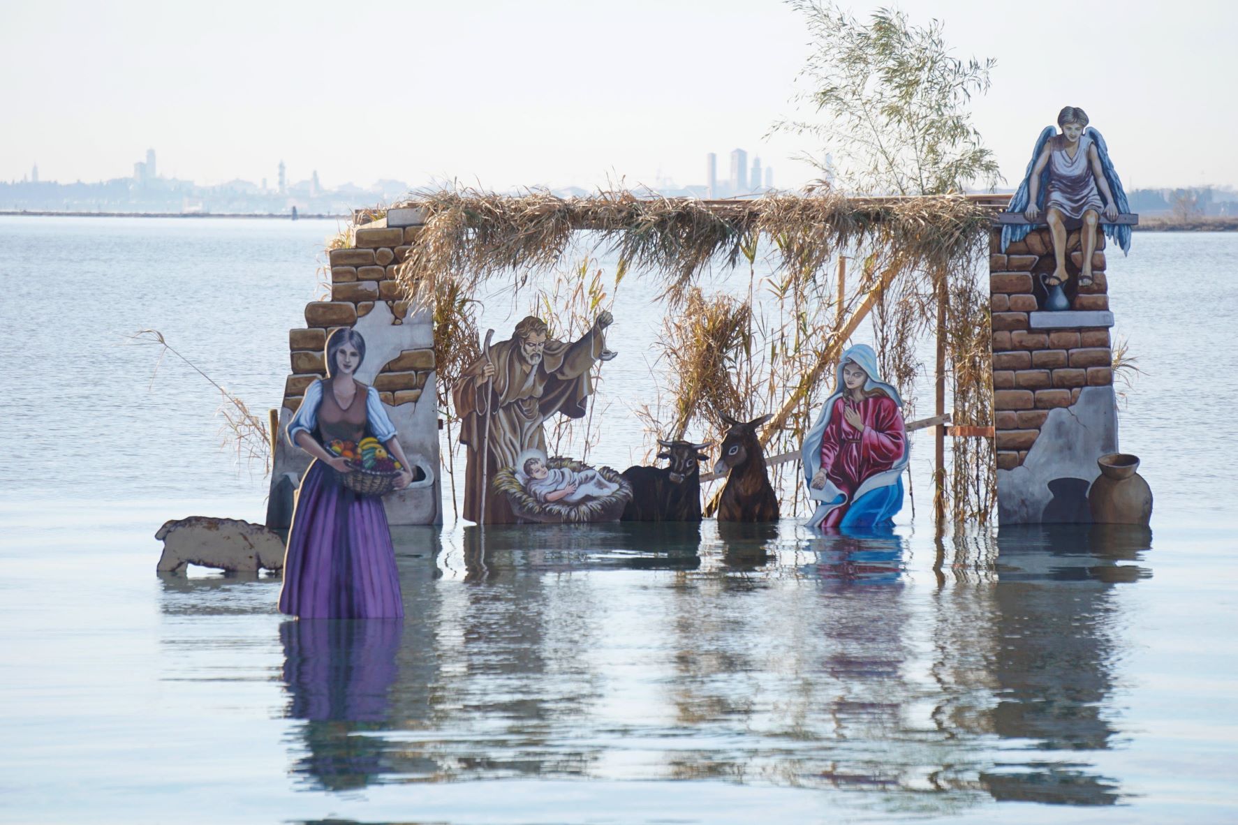 Vízben felállított betlehem a velencei Burano-sziget előtti lagúnában 2021. december 23-án. Az alkotást egy gyümölcsárus, Francesco Orazio készítette. Fotó: MTI/EPA/ANSA/Andrea Merola