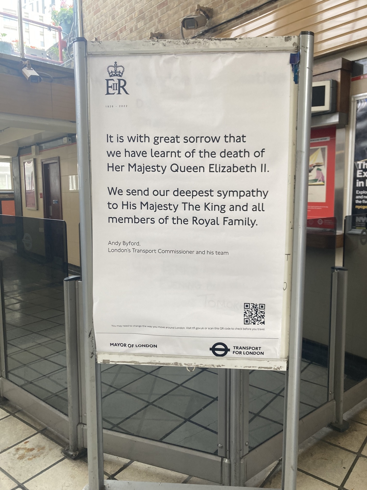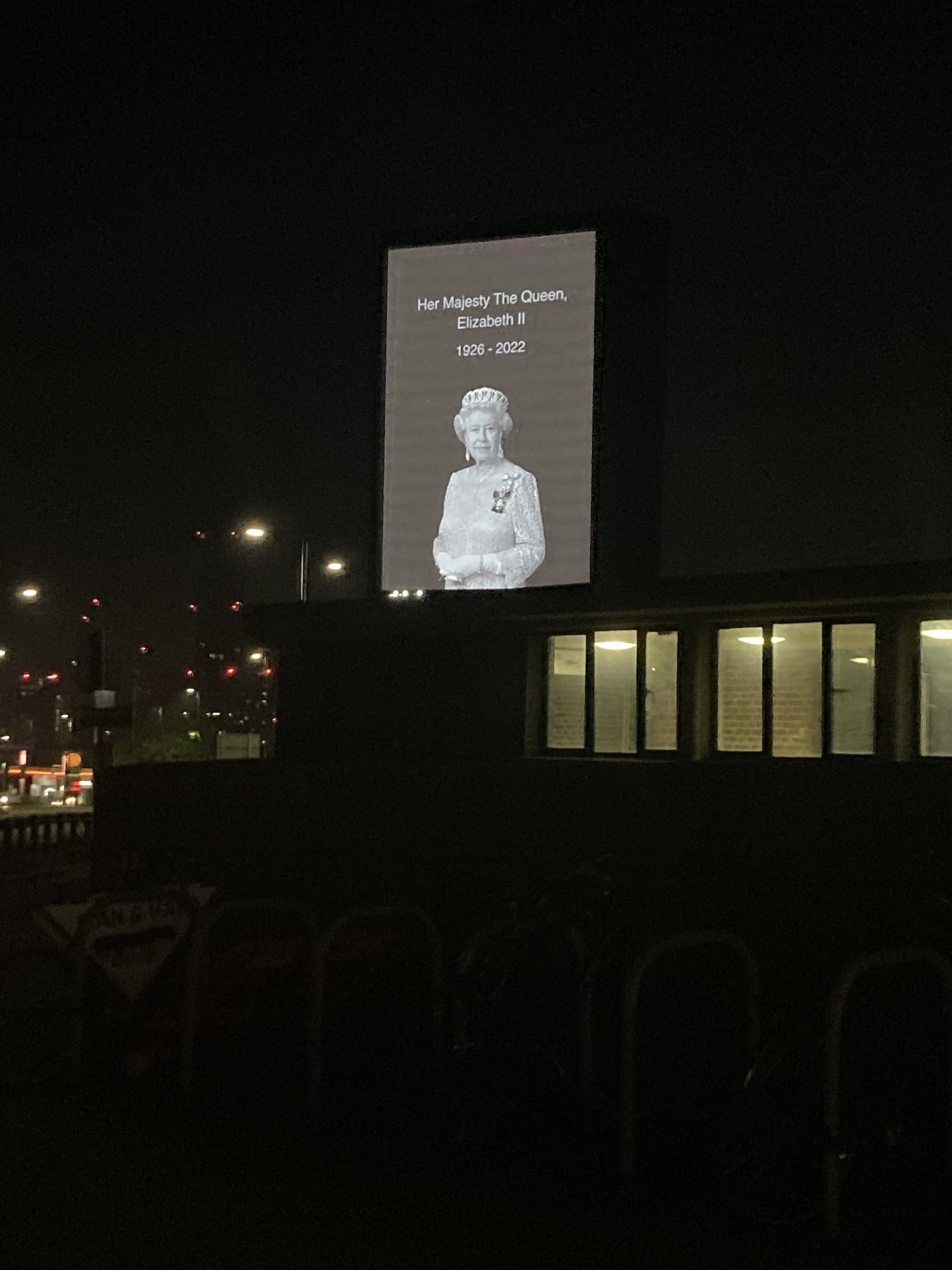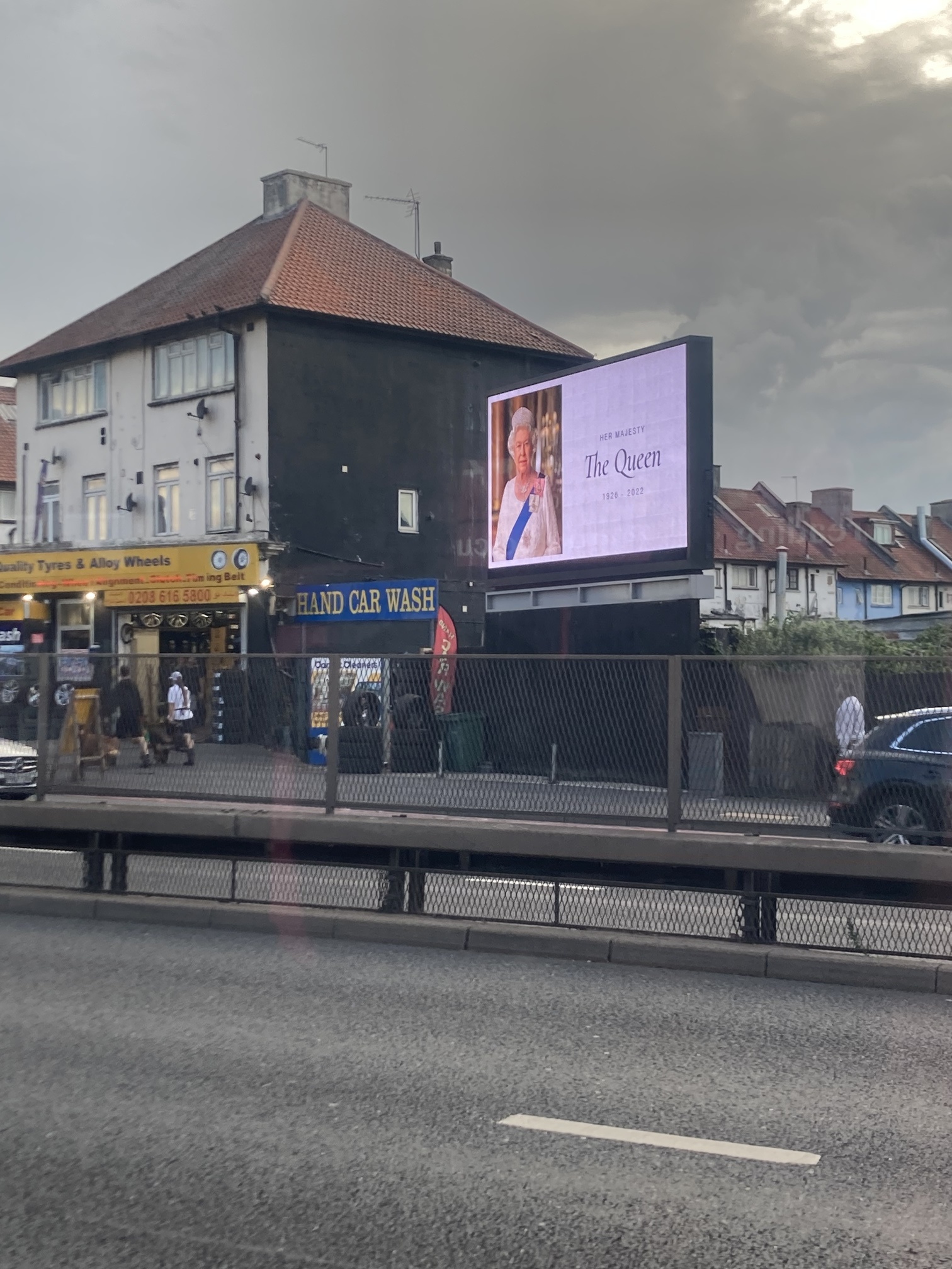 II. Erzsébet halála után egy nappal érkeztünk Londonba, ám a kora délutáni órák helyett – a járatunk nem annyira meglepő késése miatt – végül csak este foglalhattuk el a 3. zónában lévő szállásunkat, innen akkor már nem indultunk el a Buckingham-palotához, ahol a királynőre emlékezve ezrek gyűltek össze. A hotelhez vezető út alatt azonban számos helyszínen láthattuk II. Erzsébet portréját, a lutoni reptértől kezdve a főút melletti kivetítőkön át a különböző üzletek kirakatáig. Sok helyen még a platina jubileumát ünneplő zászlók is kint maradtak.