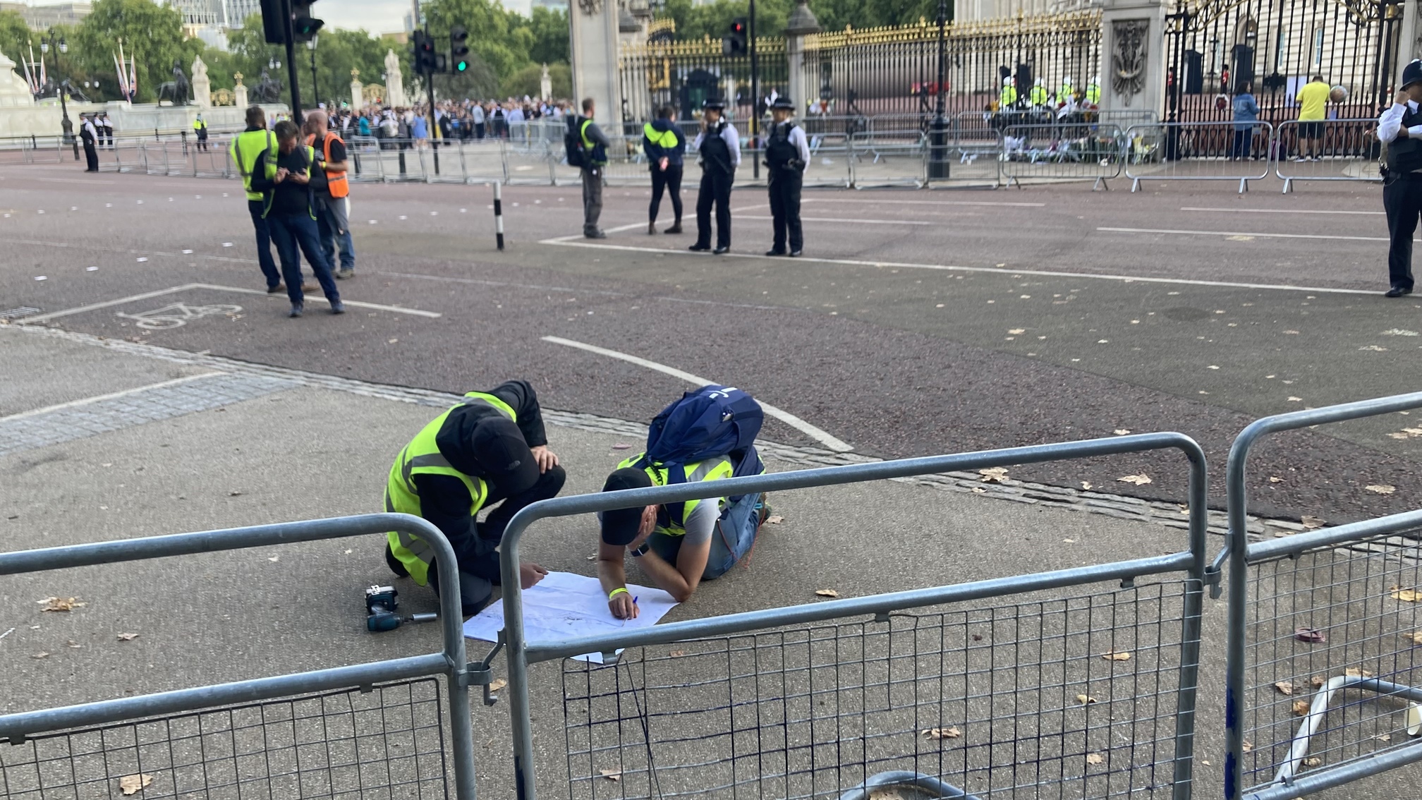Eközben a Szent Jakab-palotában ünnepélyesen is kikiáltották III. Károly trónra lépését. A ceremóniára rengetegen voltak kíváncsiak, ahogy a Buckingham-palota előtt is egyre csak gyűltek az emberek. Délután 3 óra körül sétáltunk a helyszínre, már a palota felé vezető úton is nagyon sok virágcsokrot helyeztek el a királynőre emlékezők. Mint később kiderült, valószínűleg azért is tették a csokrokat a fák köré, mert nem fértek a kordonokkal körbevett palota kerítéséhez. Valahogy egészen előre jutottunk az óriási tömegben, a palota környékén pedig egyre több jel utalt arra, és egyre többen beszéltek arról, hogy Károly hamarosan megjelenhet a nép előtt.