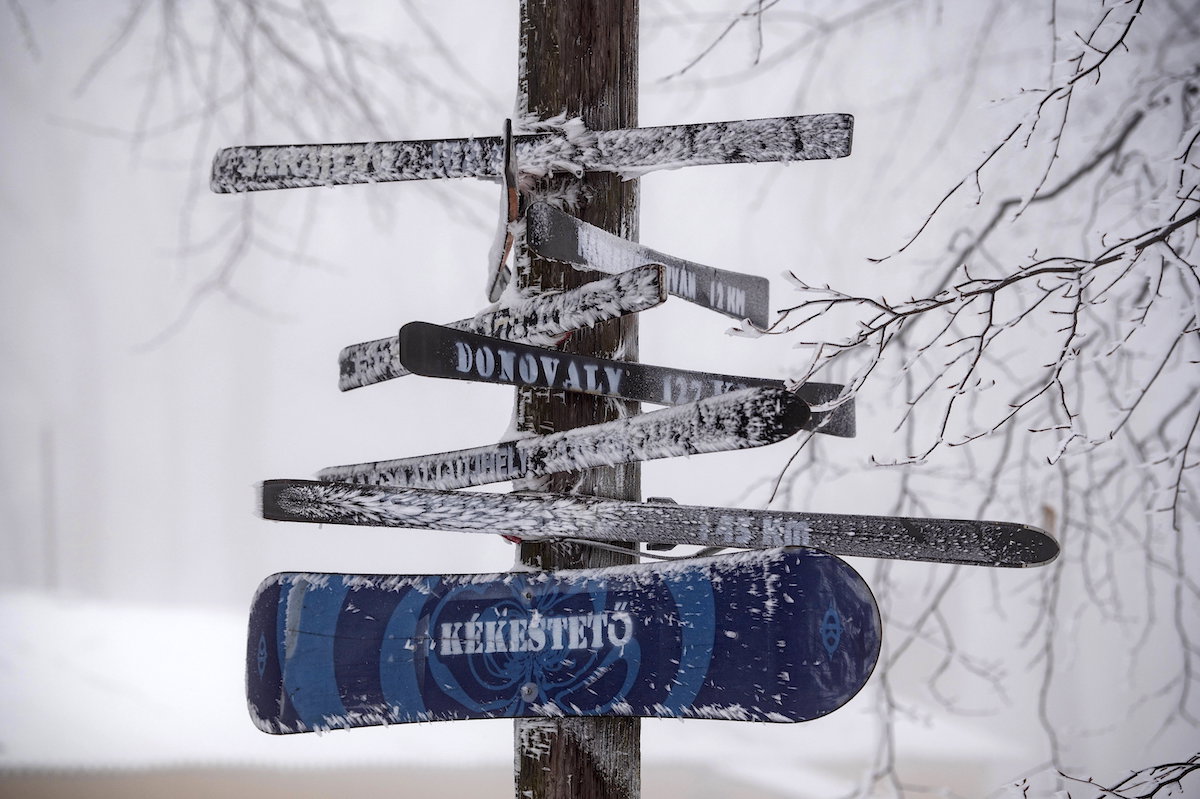 Havas útjelző táblák Magyarország legmagasabb pontjánál, a Kékestetőn Fotó: MTI/Komka Péter)