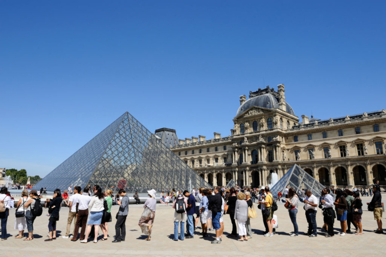 A Mona Lisa otthona az egyik leglátogatottabb múzeum, tavaly áprilisban is hosszú sor állt előtte / Fotó: Getty ImagesMárcius 1-jén bejelentették, hogy a múzeum nem nyílik meg a vírus miatt, már csak az üvegpiramis előtt fotózkodnak / Fotó: Getty Images