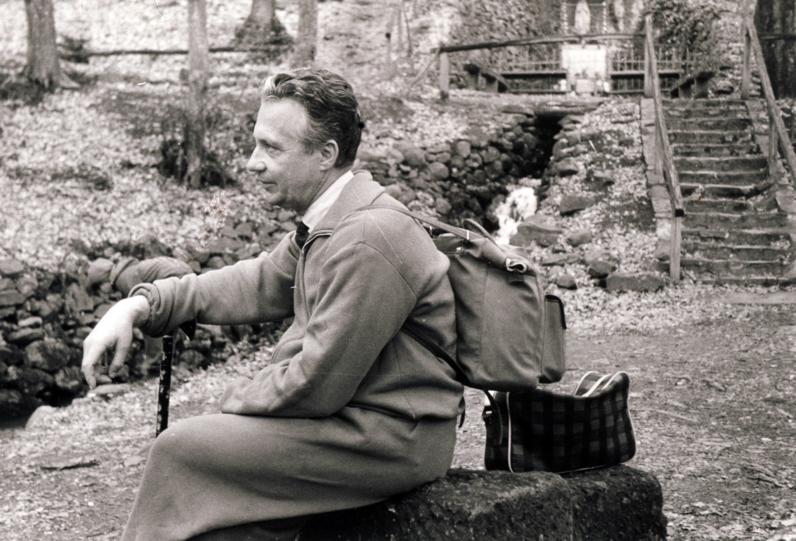 Mátrafüred, Király István irodalomtörténész egy mátrai kiránduláson, pihenő a Máriácska kegyhelynél. 1973. Fotó: Fortepan / Király Júlia