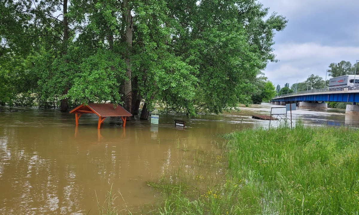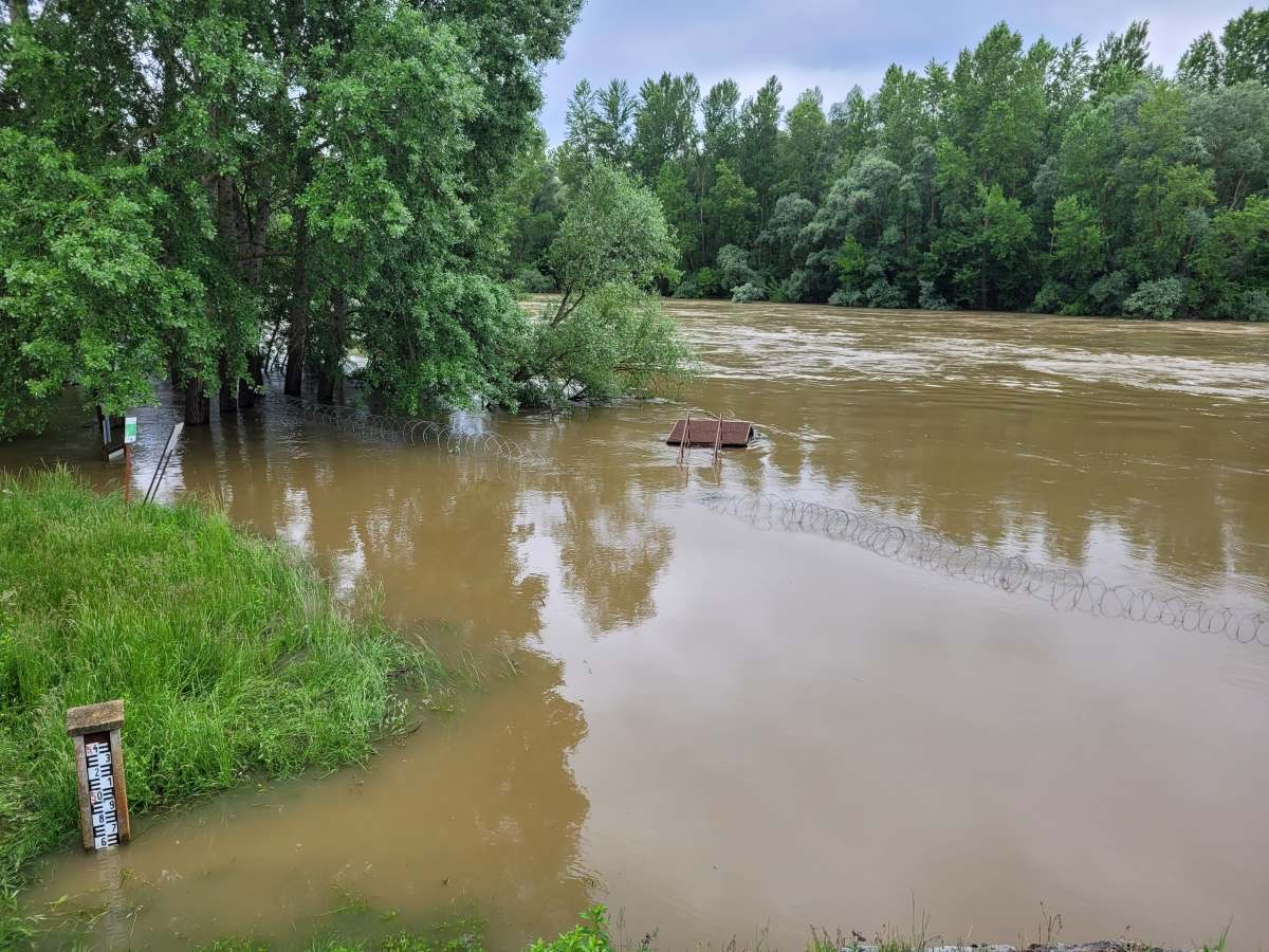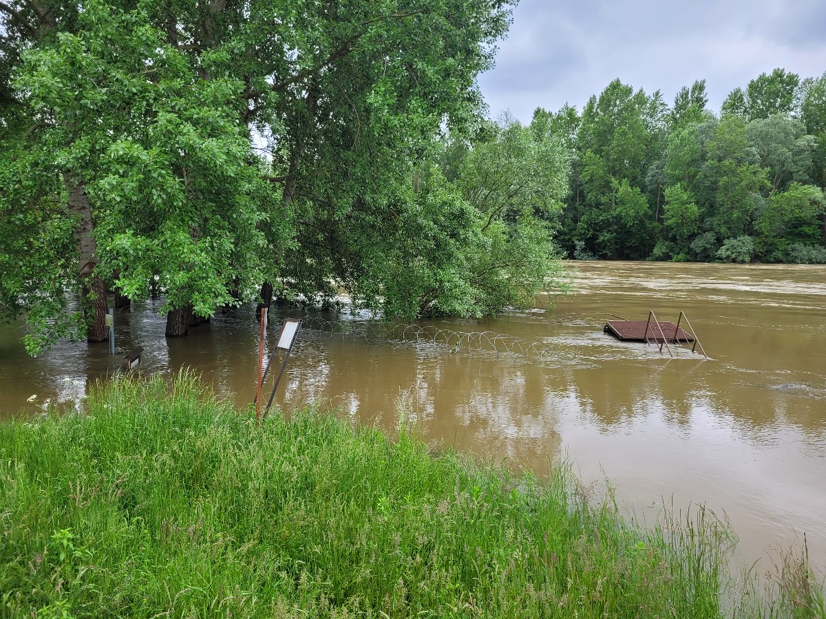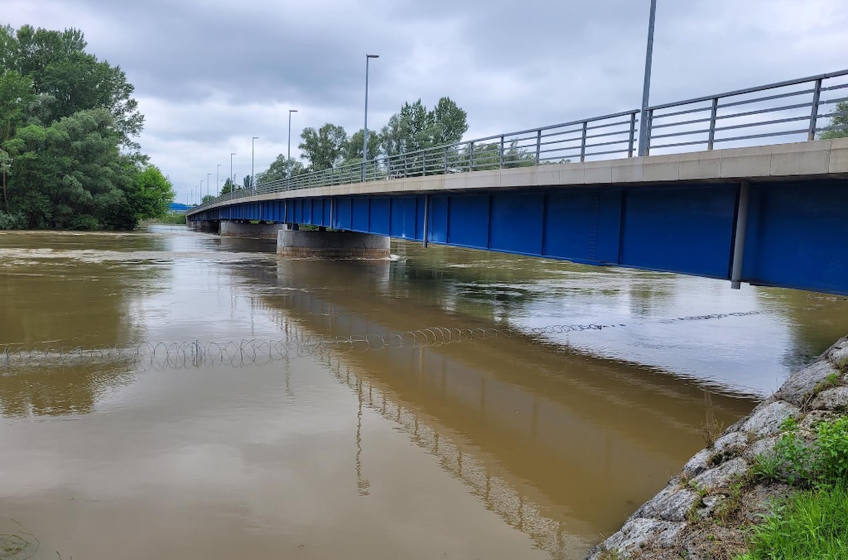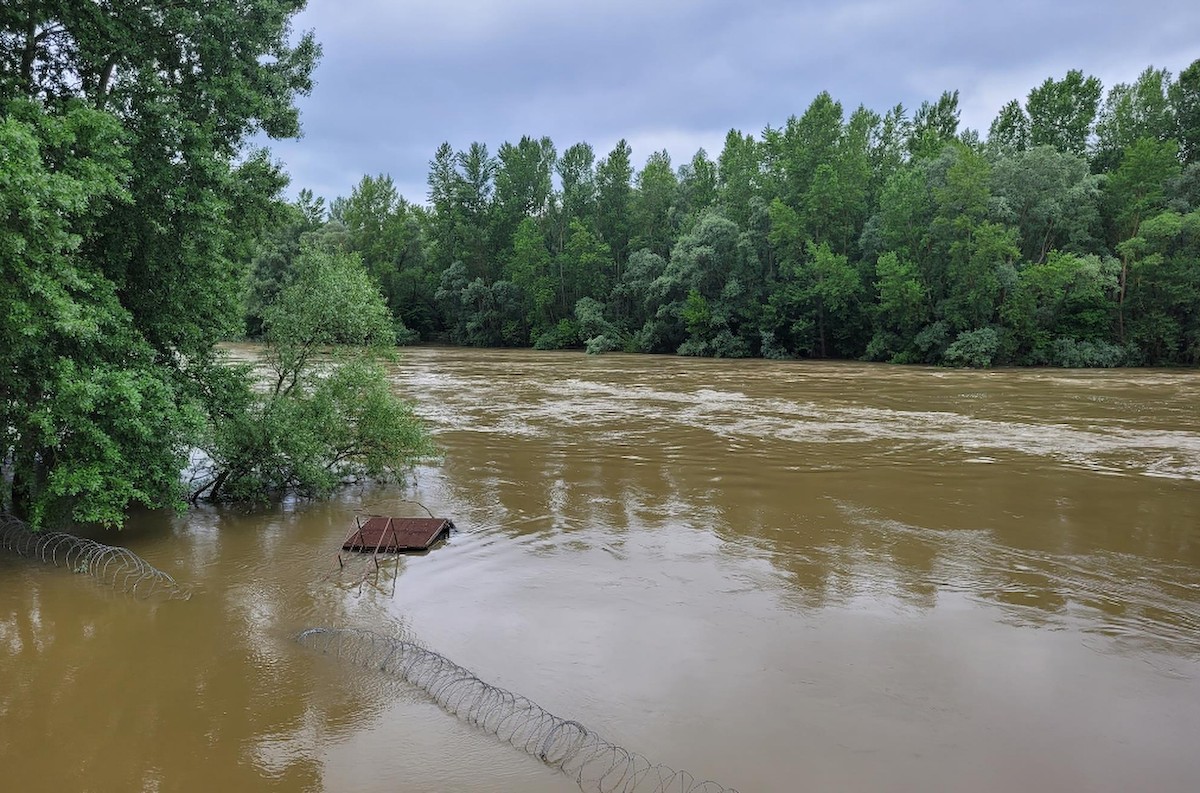 Az áradó Mura, amely ellepte a GYODA-t azaz a gyorsan telepíthető drótakadályt a letenyei magyar-horvát határnál.