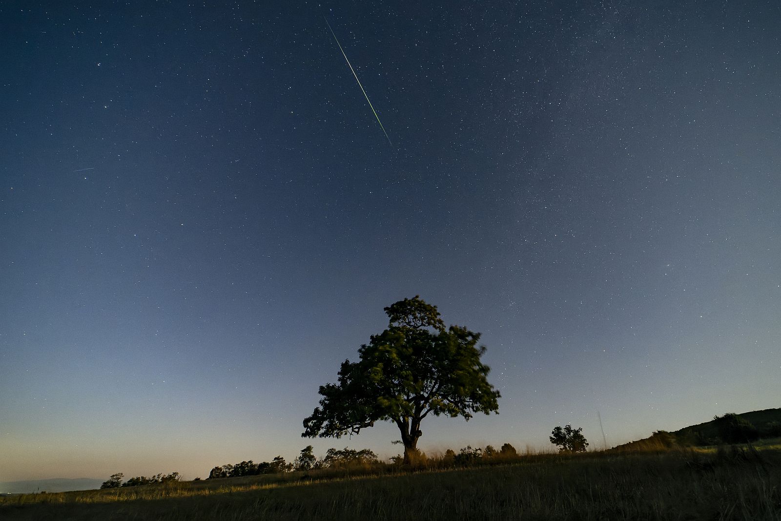 Salgótarján, 2025. augusztus 12. A hosszú expozíciós idõvel készült felvételen meteor látszik az égbolton Salgótarján közelébõl fotózva 2025. augusztus 11-én éjjel. (Fotó: MTI/Komka Péter)