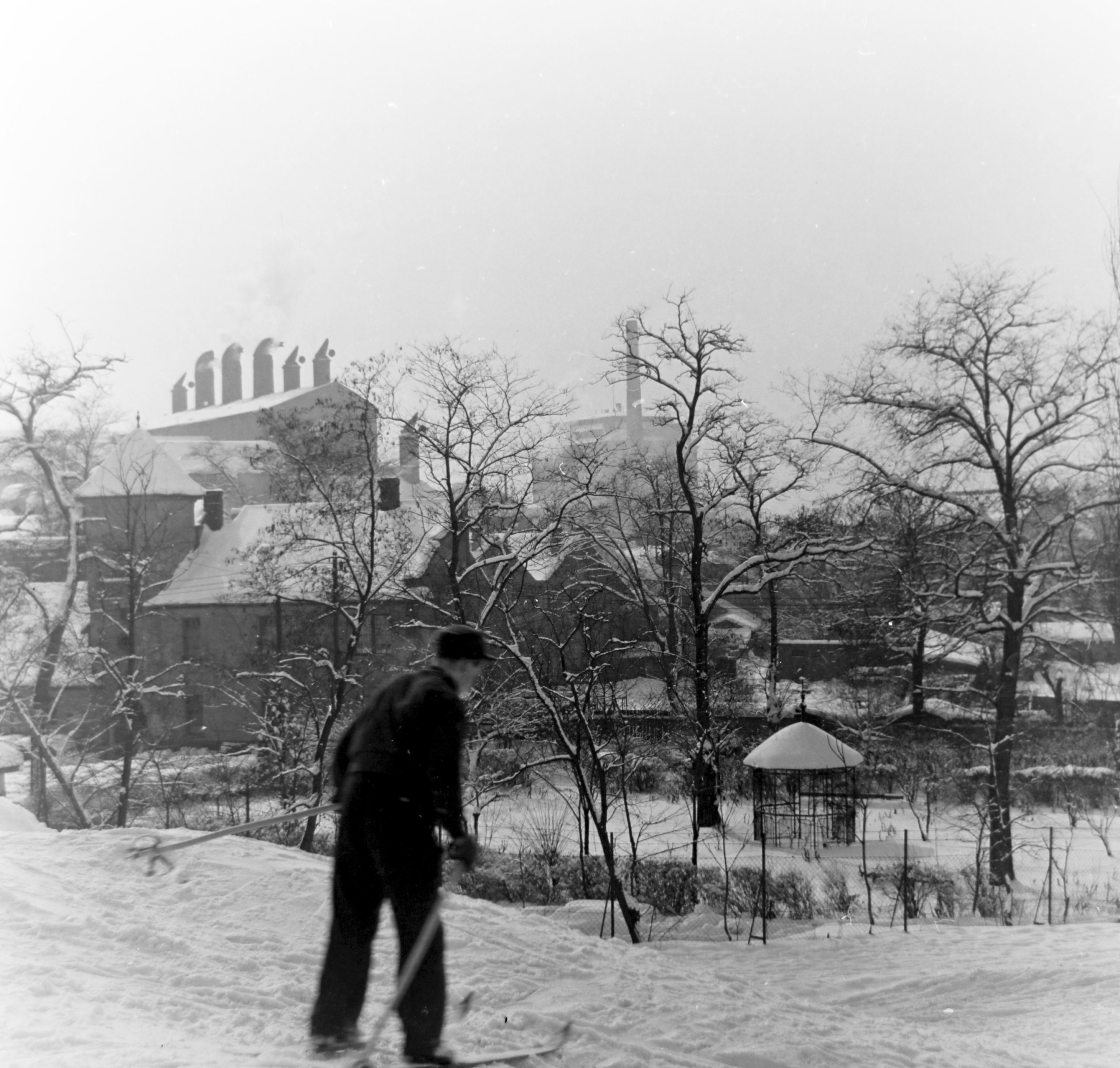 Budapesti szánkópálya a Bebek utcánál, háttérben a Kőbányai Sörgyár épületei, 1955-ben. Fotó: Fortepan / Keveházi János