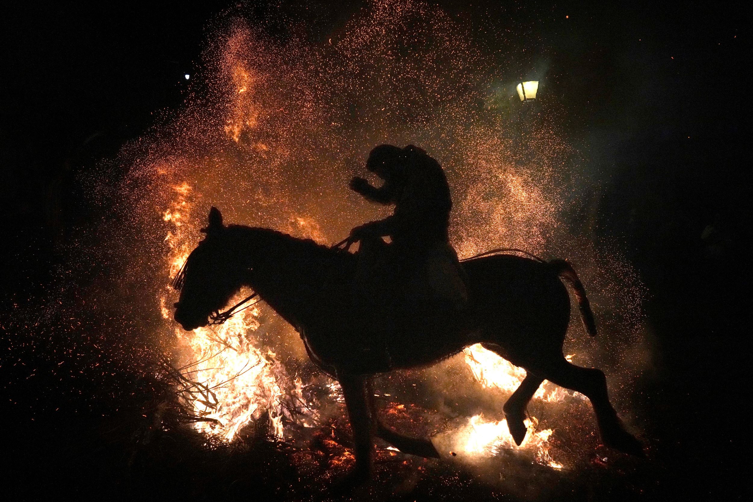 A Madridtól mintegy 100 kilométerre nyugatra fekvő, közép-spanyolországi kis faluban hagyományosan tűzlovaglással és tűzugrással tisztelegnek Szent Antalnak, az állatok védőszentjének emléke előtt a szent ünnepének előestéjén.