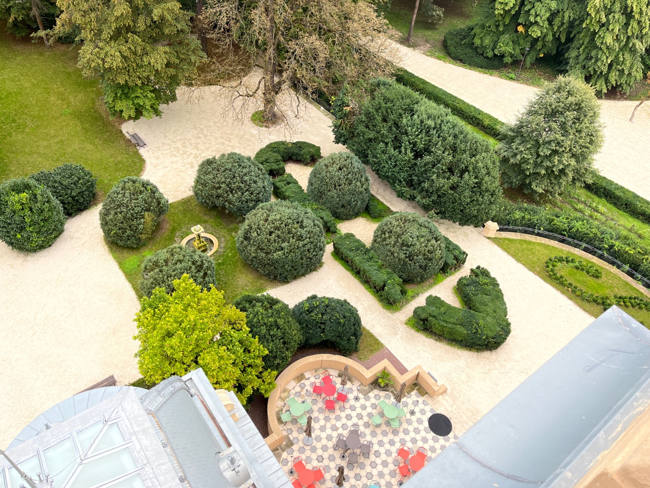 Örömmel vettem, hogy felmászhattam a toronyba és megmutathattam a férjemnek, hogy miért is szép az Alföld (mert messze el lehet látni, még ha kicsit felhős is), s jólesett a szememnek a francia, geometrikus formára nyírt bukszusokból kialakított pleasure ground.