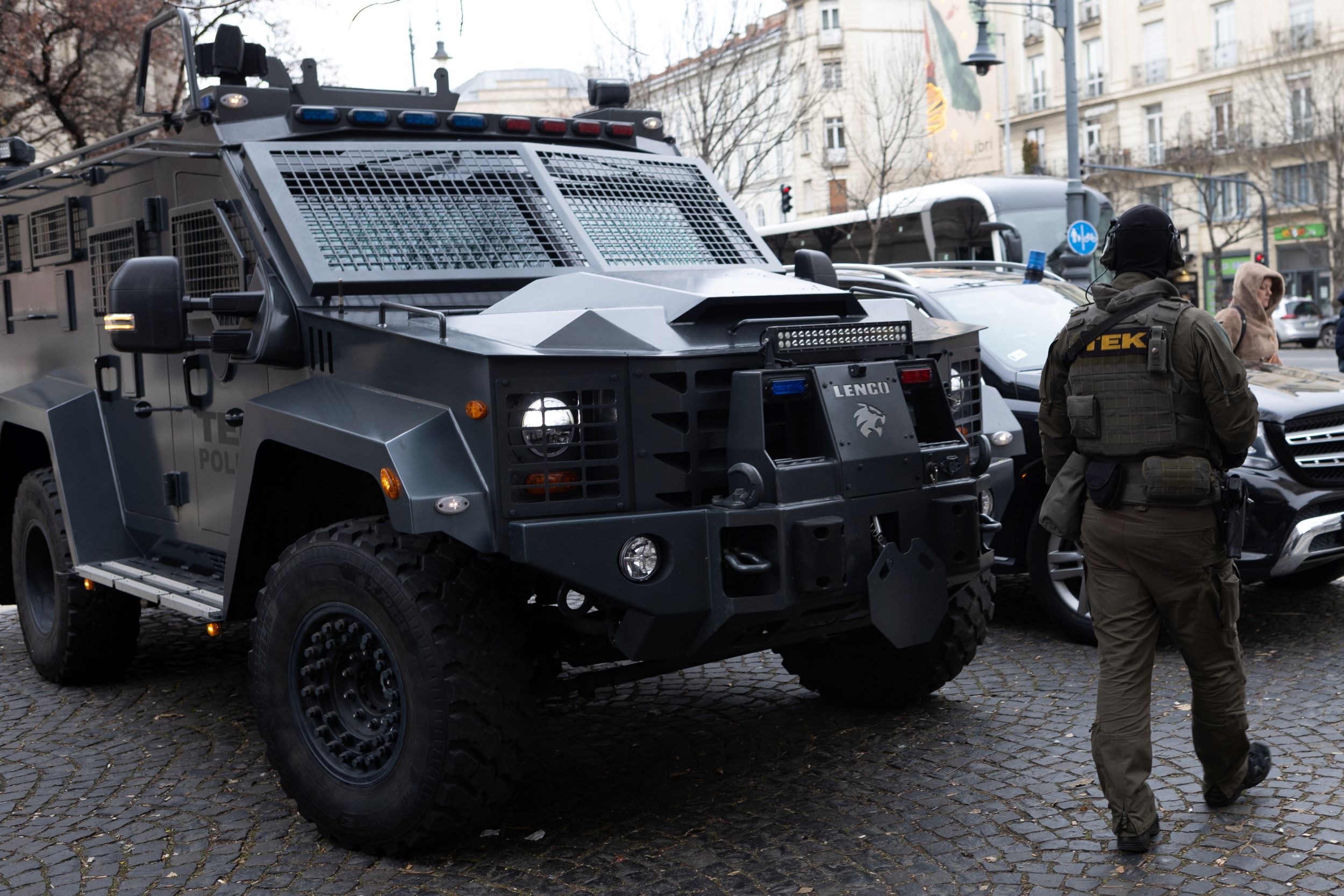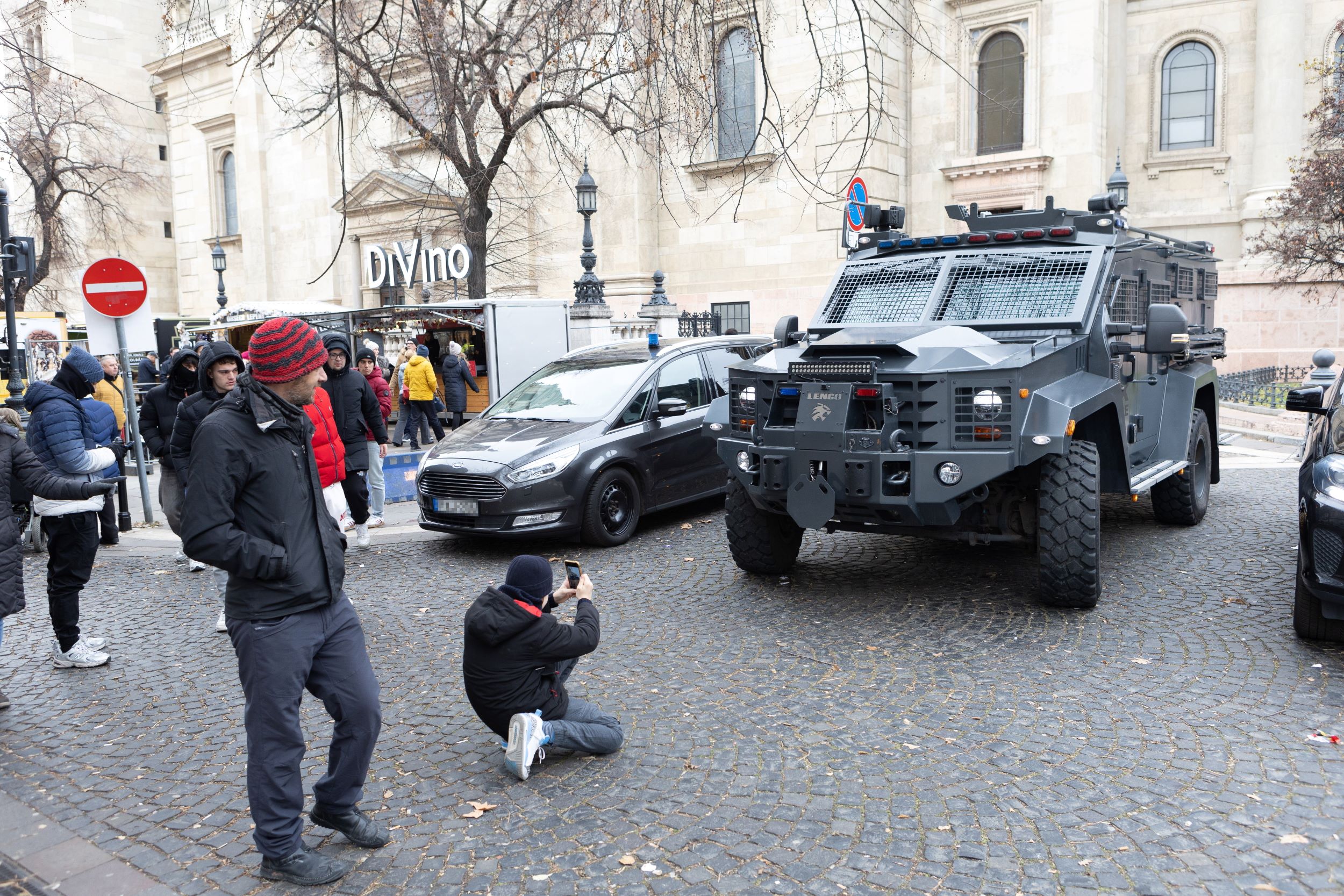 A Terrorelhárítási Központ (TEK) egysége egy Lenco páncélozott járművel a Szent István-bazilika előtt karácsonyi vásár helyszínén Budapesten 2024. december 22-én. A TEK egységei jelen vannak a vidéki és a fővárosi karácsonyi vásárokon. Fotó: MTI/Kocsis Zoltán