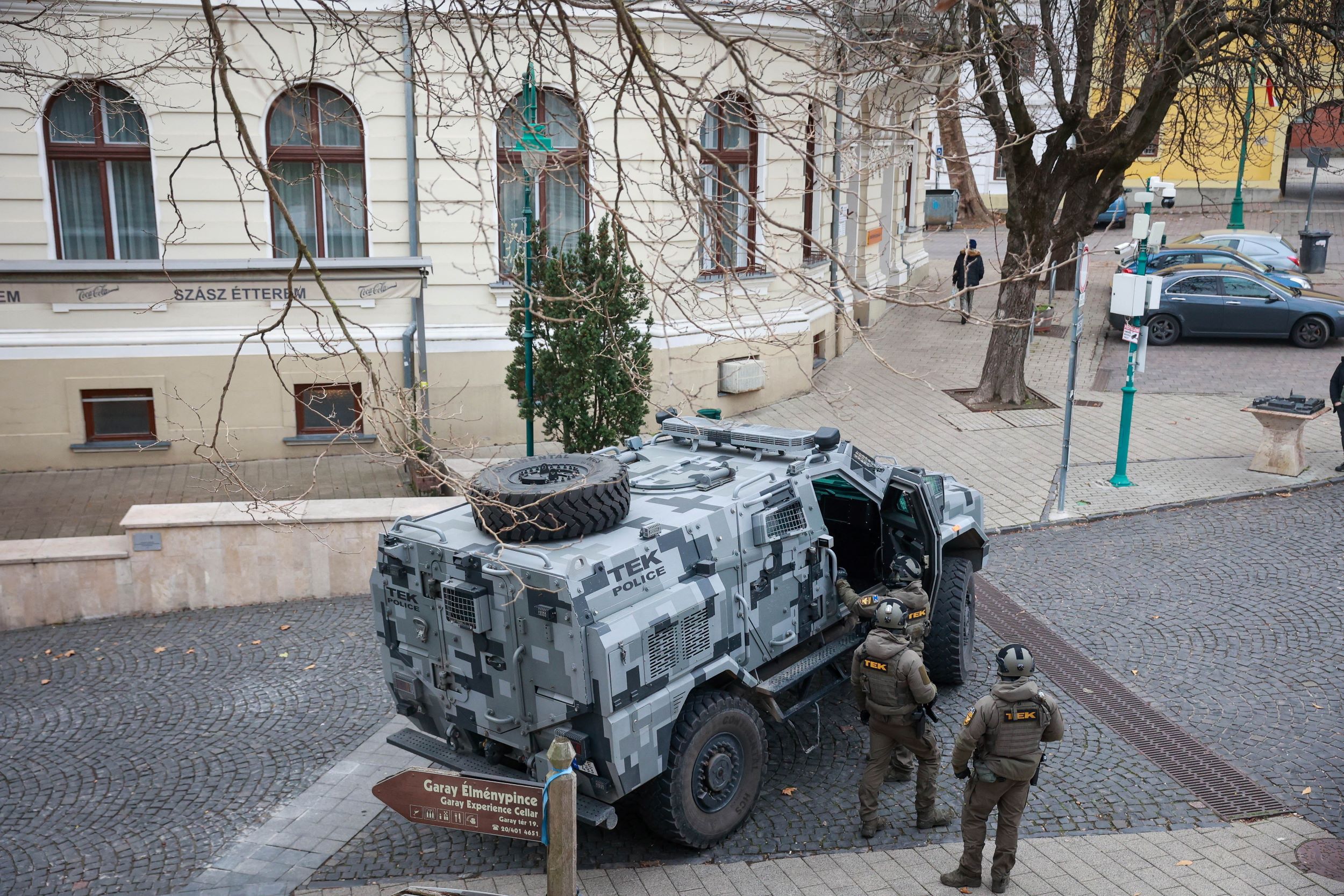 A Terrorelhárítási Központ (TEK) egysége egy Scorpion páncélozott járművel Szekszárd sétálóutcája előtt, a karácsonyi vásár helyszíne közelében 2024. december 22-én. Fotó: MTI/Kiss Dániel