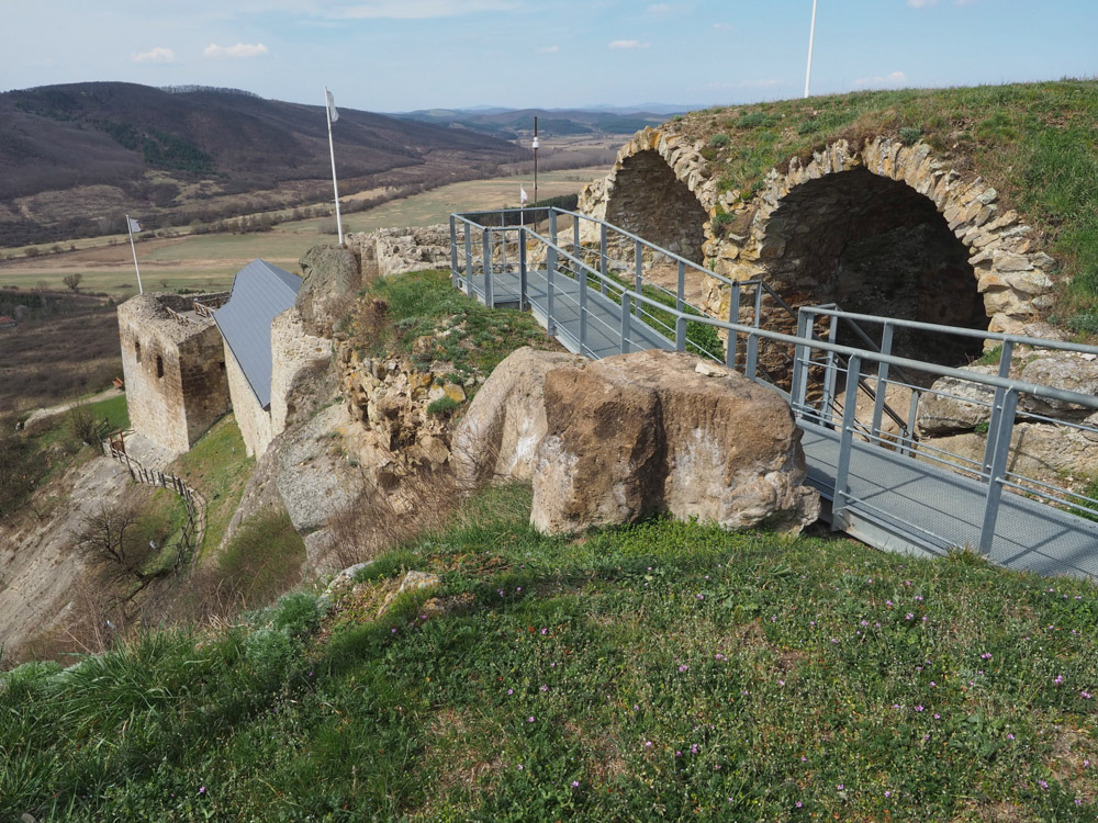 Egy sziklába vájt gyalogos átjárón juthatunk a felső várba, amelynek közepén egykoron a mindenkori földesúr lakhelye, a lakótorony volt.