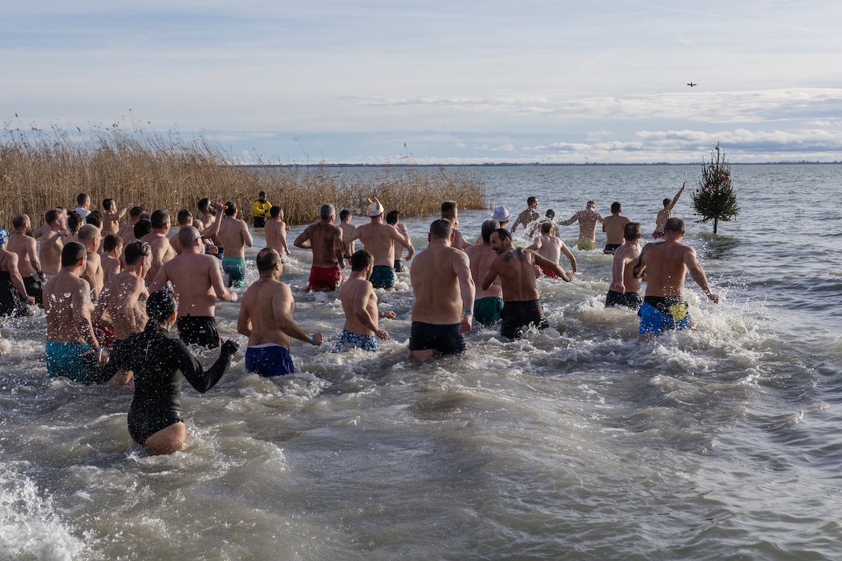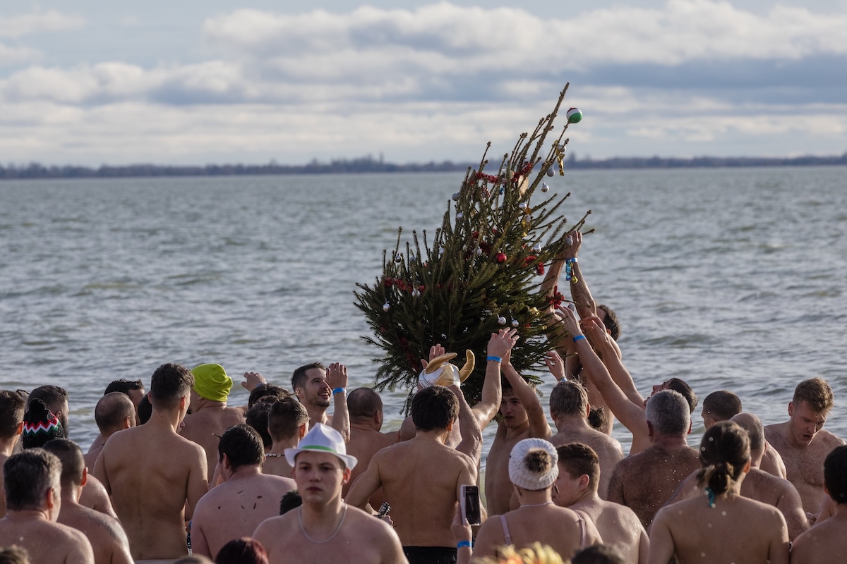 Idén is több százan gyűltek össze az új év első napján a Balaton partján, hogy megmártózzanak a hideg vízben. Ezúttal sem maradhatott el az a szokás, amikor a vízből kihozzák a feldíszített karácsonyfát, amit a rendezvény szervezői december 24-én vitték be a Balatonba.