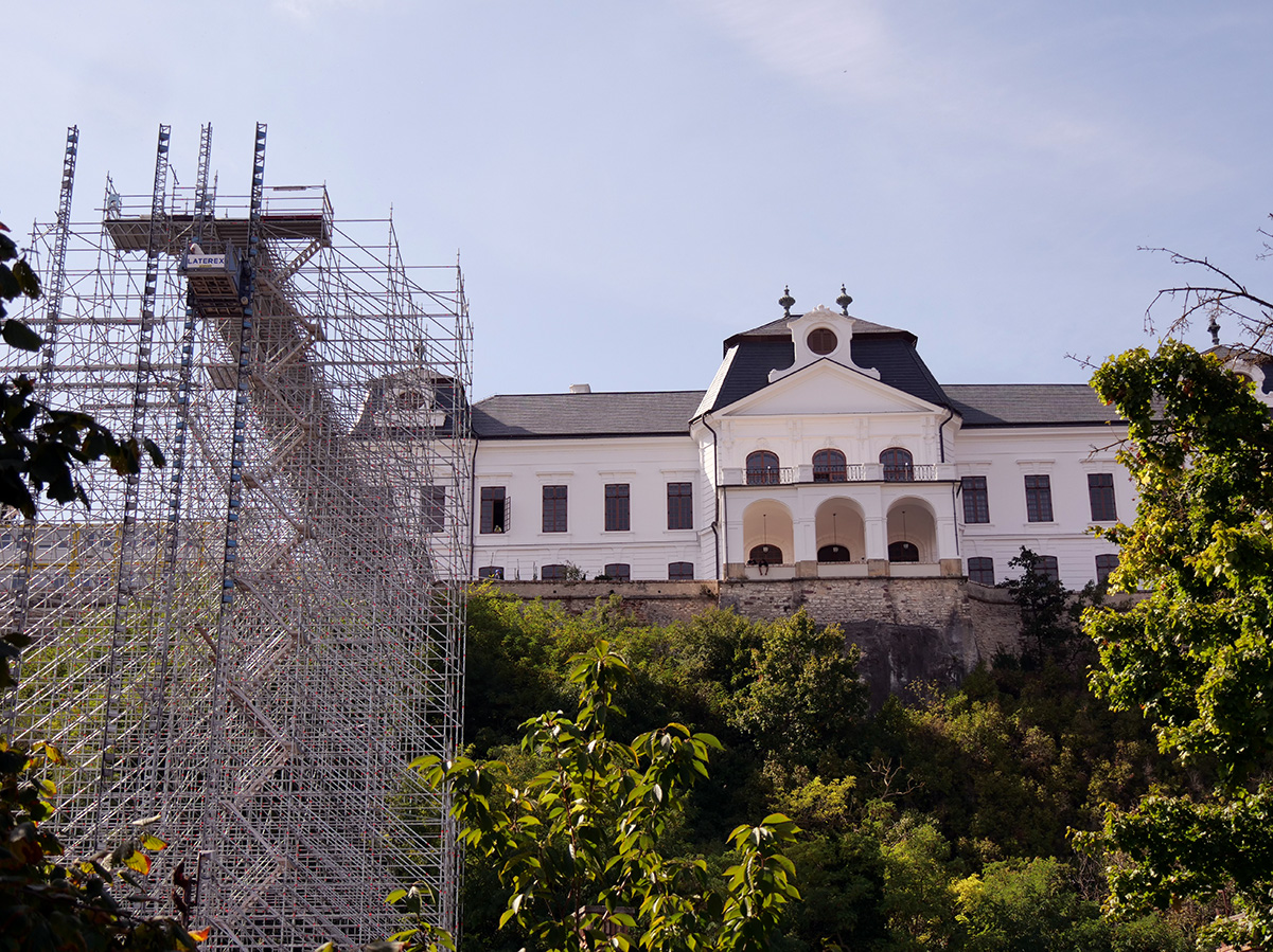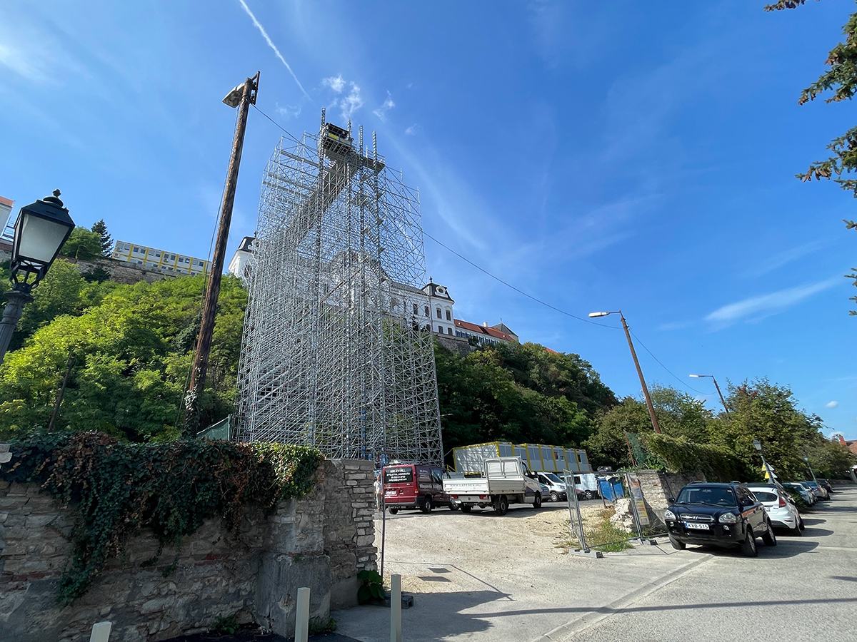 Mivel csak egyetlen nap állt rendelkezésemre, a vasútállomásról egyenesen ide vezetett utam. Már a Séd patak partján sétálva, a História kertből látni lehetett, hogy a Várhegy oldalába egy hatalmas állványzat magasodik, amin fel-alá közlekedett a lift, hol munkásokkal, hol építőanyagokkal. Ebből sejteni lehetett, hogy a kis utcákon felsétálva mire lehet számítani.