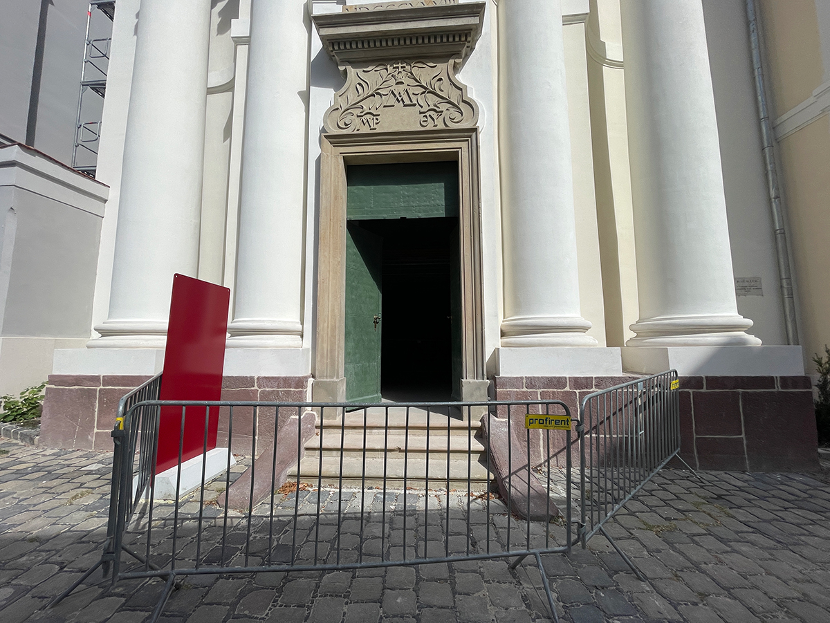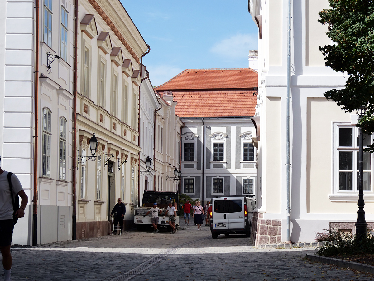 A Vár utca vége felé haladva több bejáratot látni, ami elkordonozva áll, az ajtók mögött pedig munkások dolgoznak. Sok esetben azt sem lehet tudni, milyen épületet látunk, mivel az épület előtt álló piros színű tájékoztatótáblákra sem került fel még semmi. Mivel először jártam Veszprémben úgy, hogy jobban körül tudtam nézni,