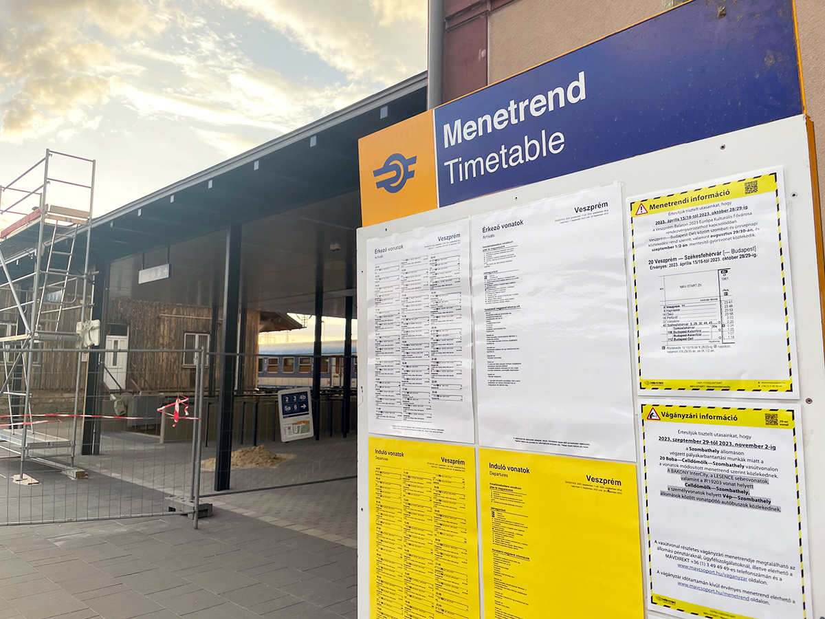 Aki ma Veszprémbe érkezik, kordonokat, állványokat, megbontott aszfaltot, lezárt területet és mobil WC-t talál az állomás területén, ami finoman szólva sem a Kulturális Főváros szellemiségét idézi meg. Ezt tetézi a napjainkban már szokatlan papír alapú menetrendi tábla, ahol megpróbálhatják az utasok kideríteni, mikorra van meghirdetve az általuk kiválasztott vonat érkezése.