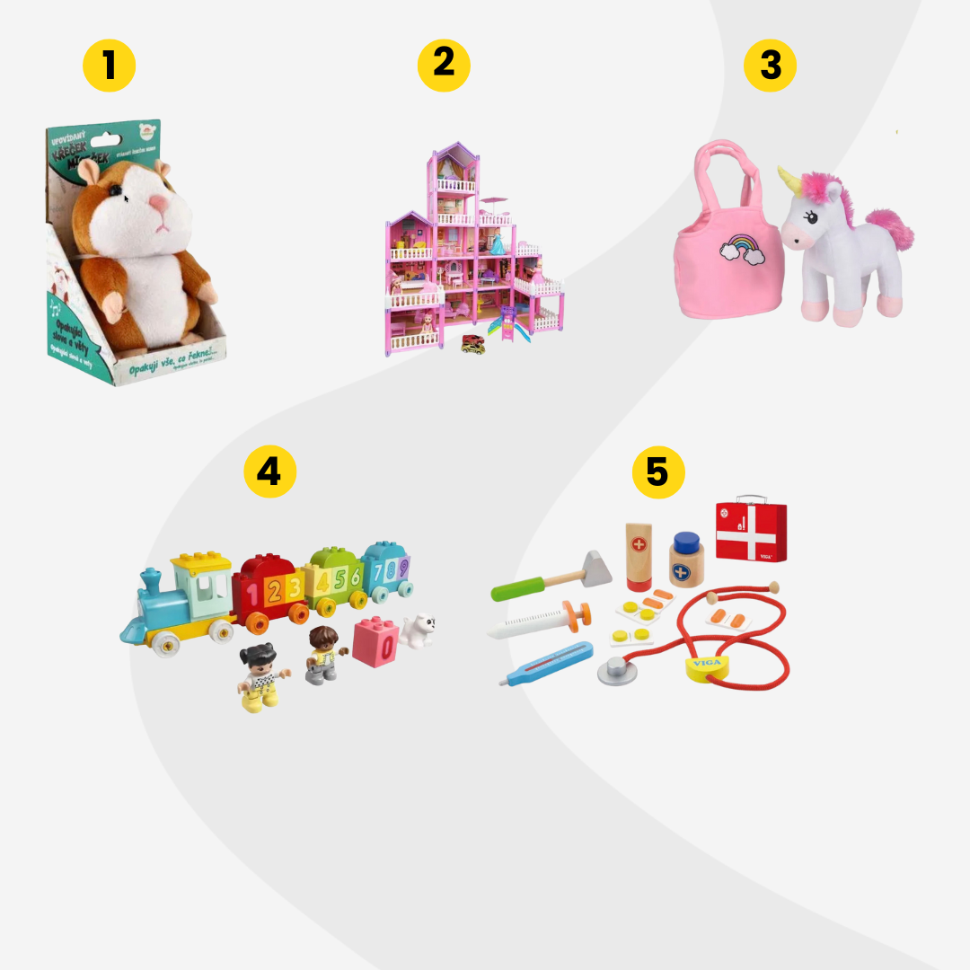 Ebben a korosztályban klasszikus és mindig telitalálat a LEGO DUPLO My First: Számvonat (4) : a színes, guruló számvonat segít játékos formában megismerkedni a számokkal, miközben fejleszti a kézügyességet is. Arcra mosolyt csal a puha, ölelgetnivaló plüss unikornis (3) figura, ami remek társ meséhez, alváshoz vagy csak egy kis vigasztaláshoz. Az interaktív játékok kedvelőinek jó választás a Teddies beszélő hörcsög (1), amely utánozza a hangunkat – rengeteg mókás helyzetet teremtve.
