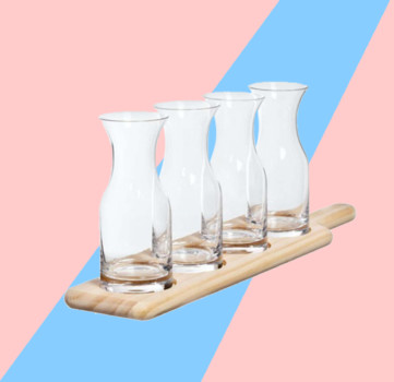 Láttál mostanában ennél stílusosabb kínáló szettet? Szerintünk aligha. Szép, nagy, bő két és fél deci űrtartalmú, vizeskancsót formáló üvegpoharak egy kenyérvágó deszkára hajazó fatálcán. Ez a kombináció tökéletesen megidézi a vidám és egyszerűségében szép vidéki, házias stílust. Ha ennek vagy a híve, illetve ha sok fa evőeszközzel operálsz, akkor ennek a szettnek az asztalodon – avagy a kezedben – a helye!
