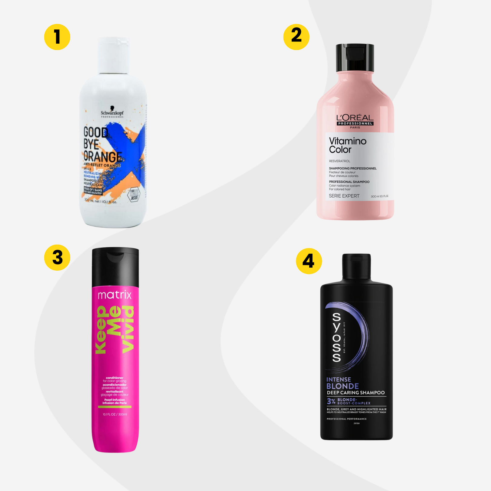 A Schwarzkopf Good Bye Orange (1) szintén a sárga és vörös melléktónusok semlegesítésében jó, de ebben a samponban kék és zöld pigmentek vannak, és olyan hajra tervezték, amely eredetileg középbarna, vagy sötétszőke. A Good Bye Orange a sötétebb hajalapon megakadályozza a hideg tónusok (vagyis a szőke hajszín) fakulását és narancssárgára váltását.