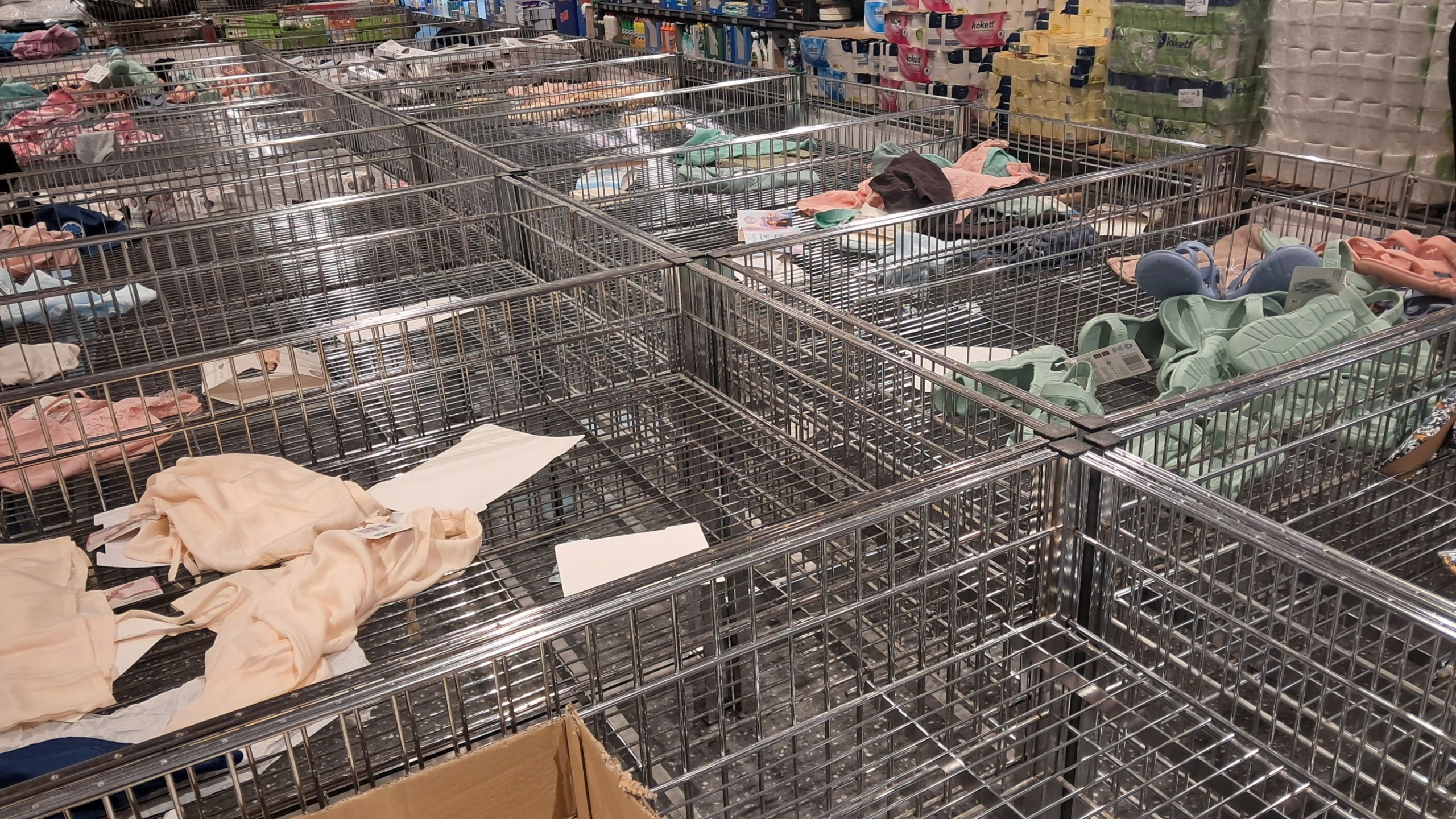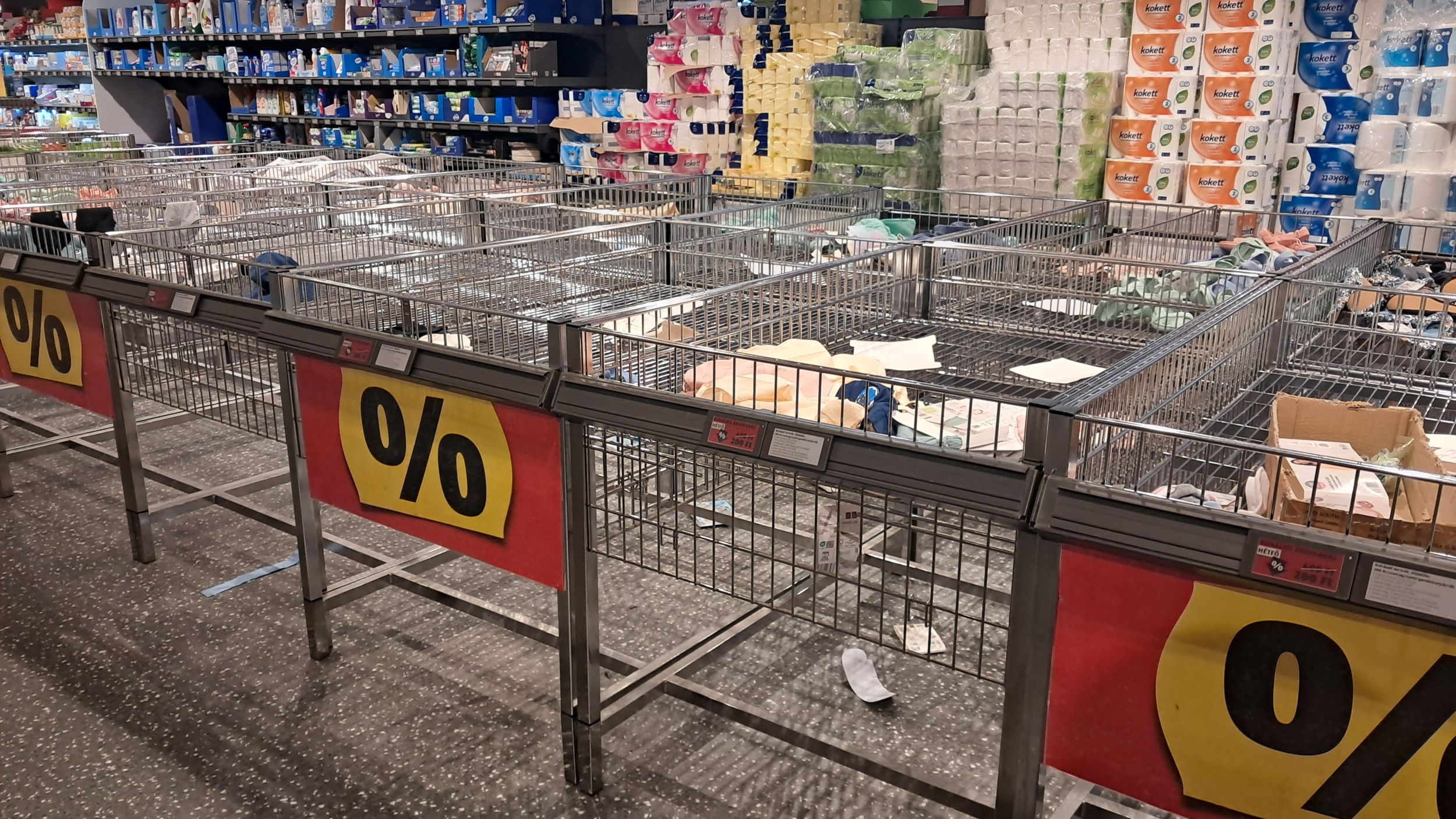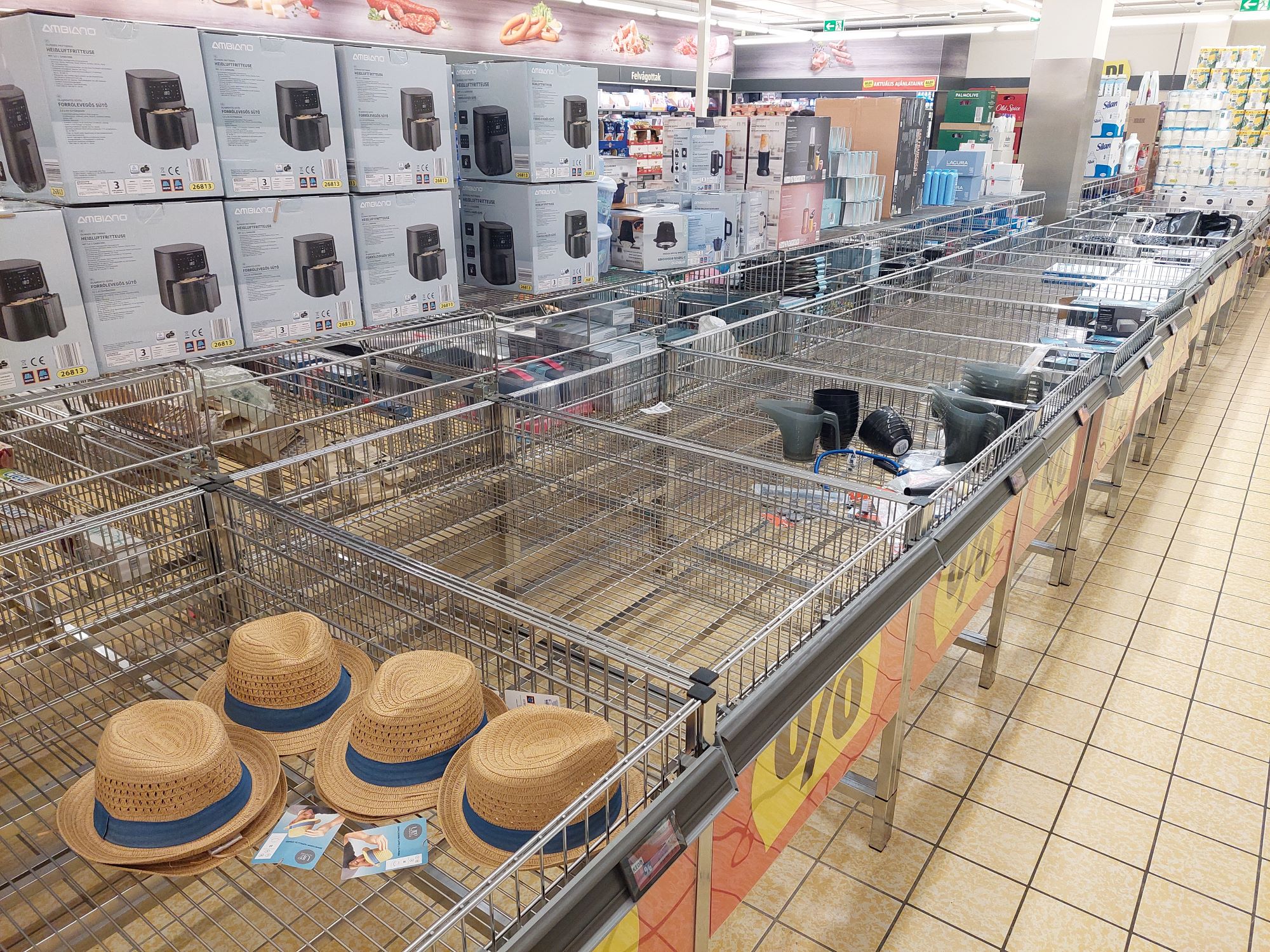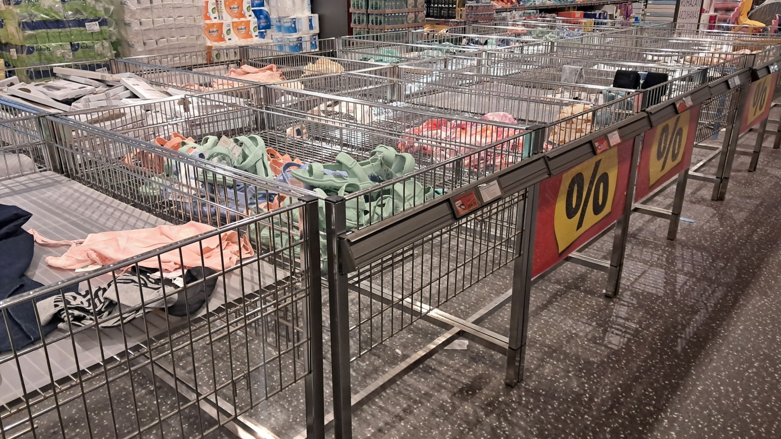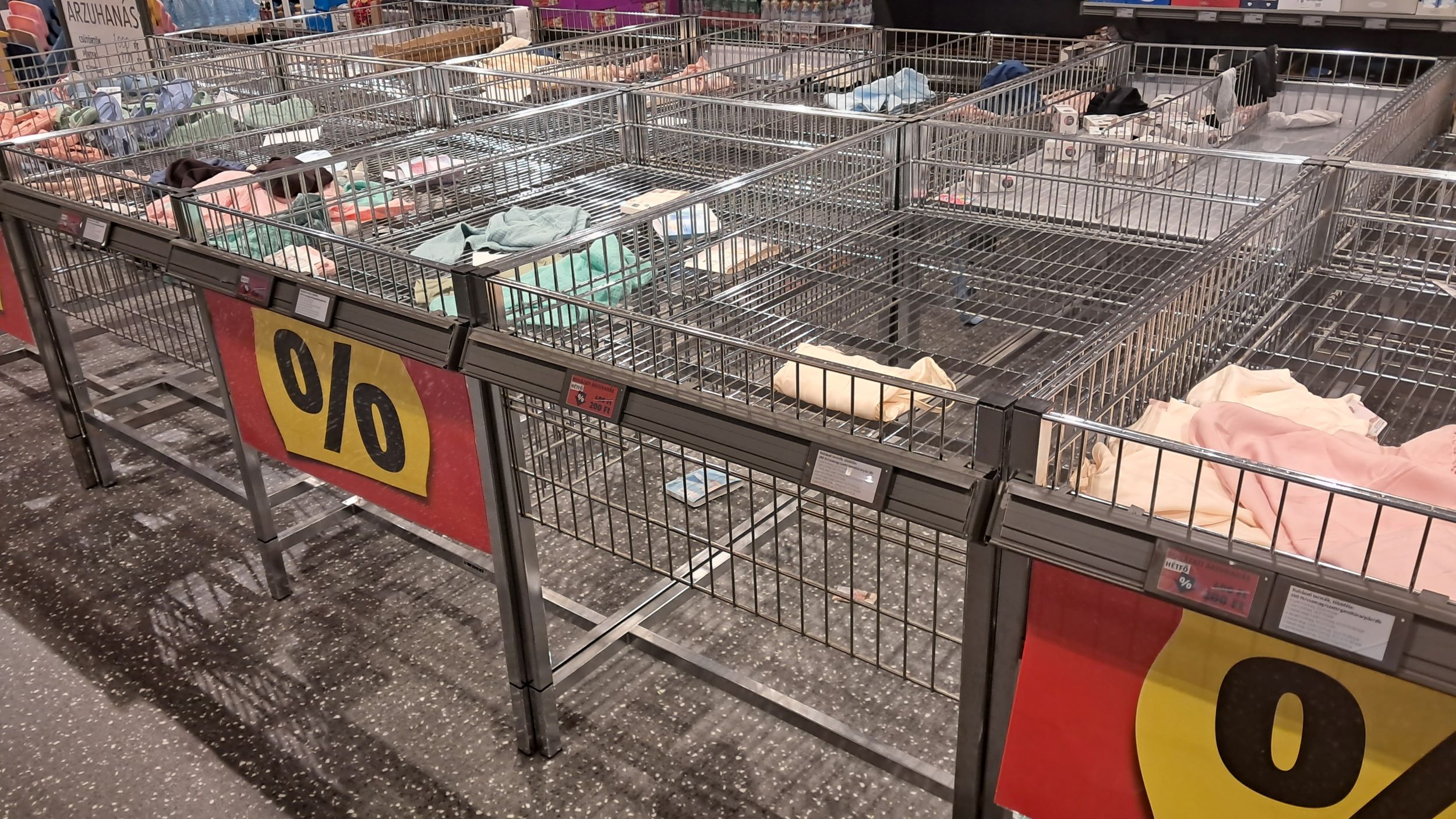 A ruházati árzuhanás utolsó napján négy fővárosi Aldiban is szinte ugyanaz a kép fogadta kollégánkat: az 5 forintos napra gyakorlatilag már semmi sem maradt a kínálatból. A fotók a Kossuth Lajos utcai (V. kerület), a Petneházy utcai (XIII. kerület), Huszti úti (III. kerület), és a Szentendrei úti (III. kerület) Aldiban készültek szeptember 17-én.