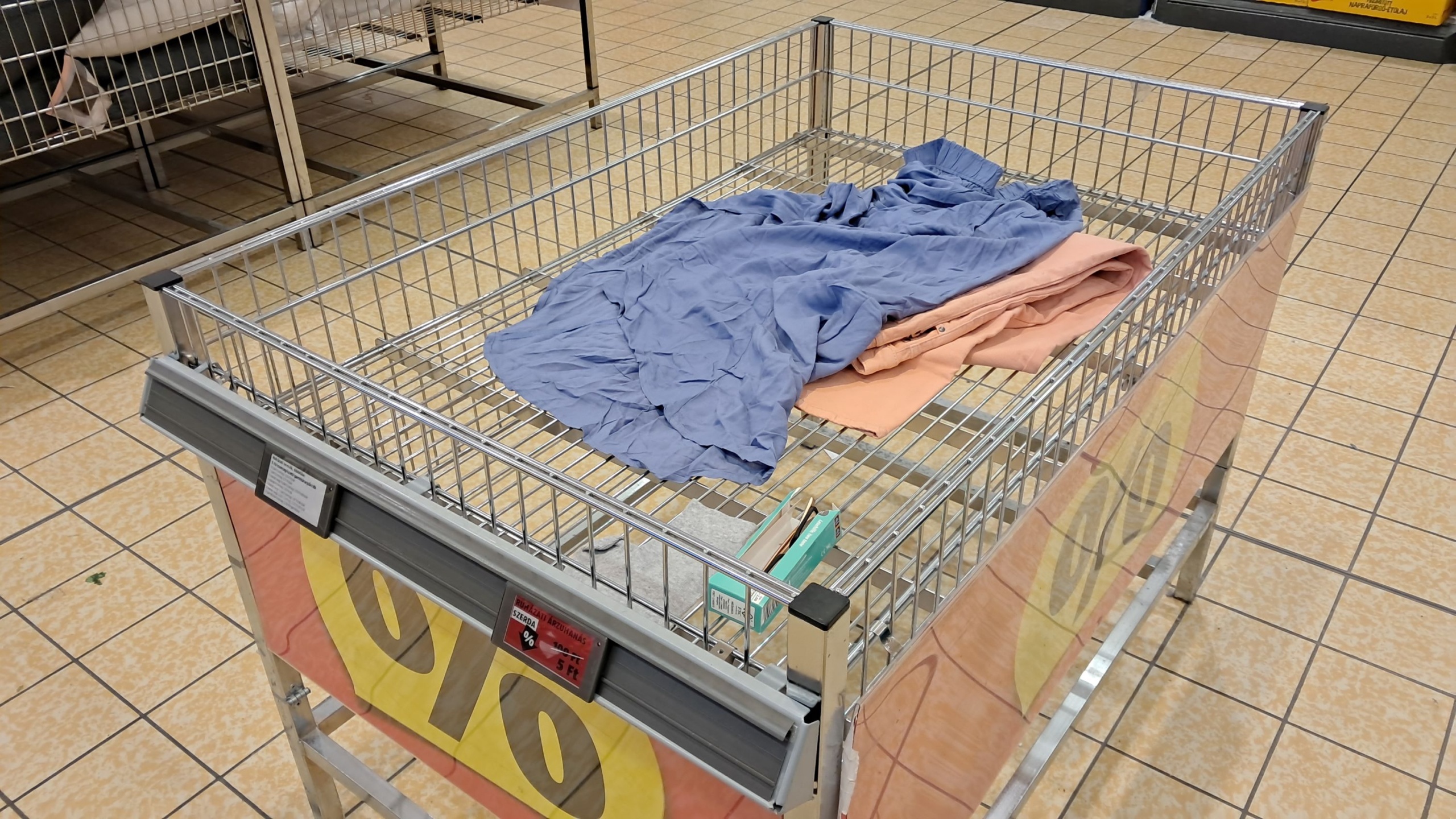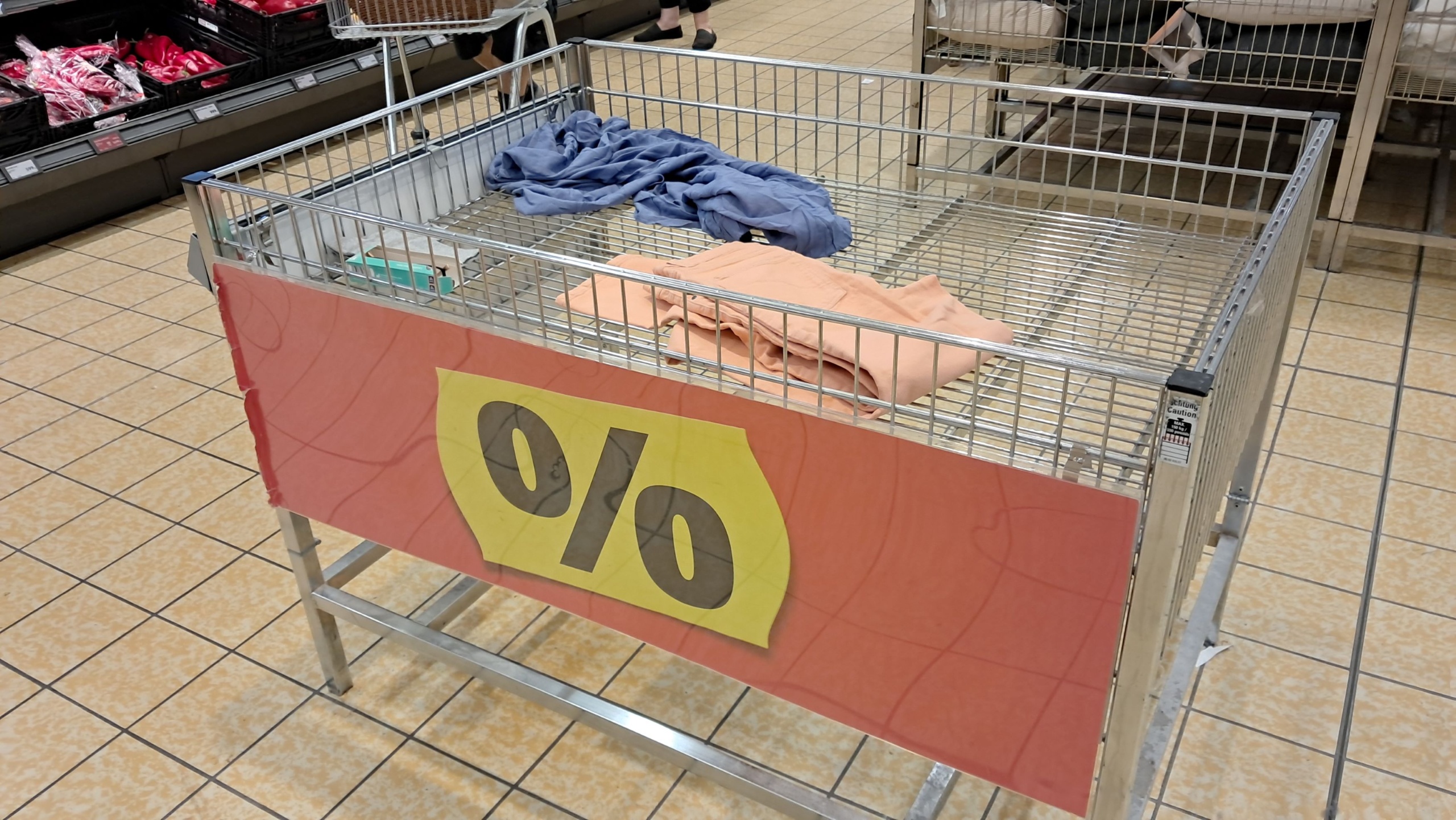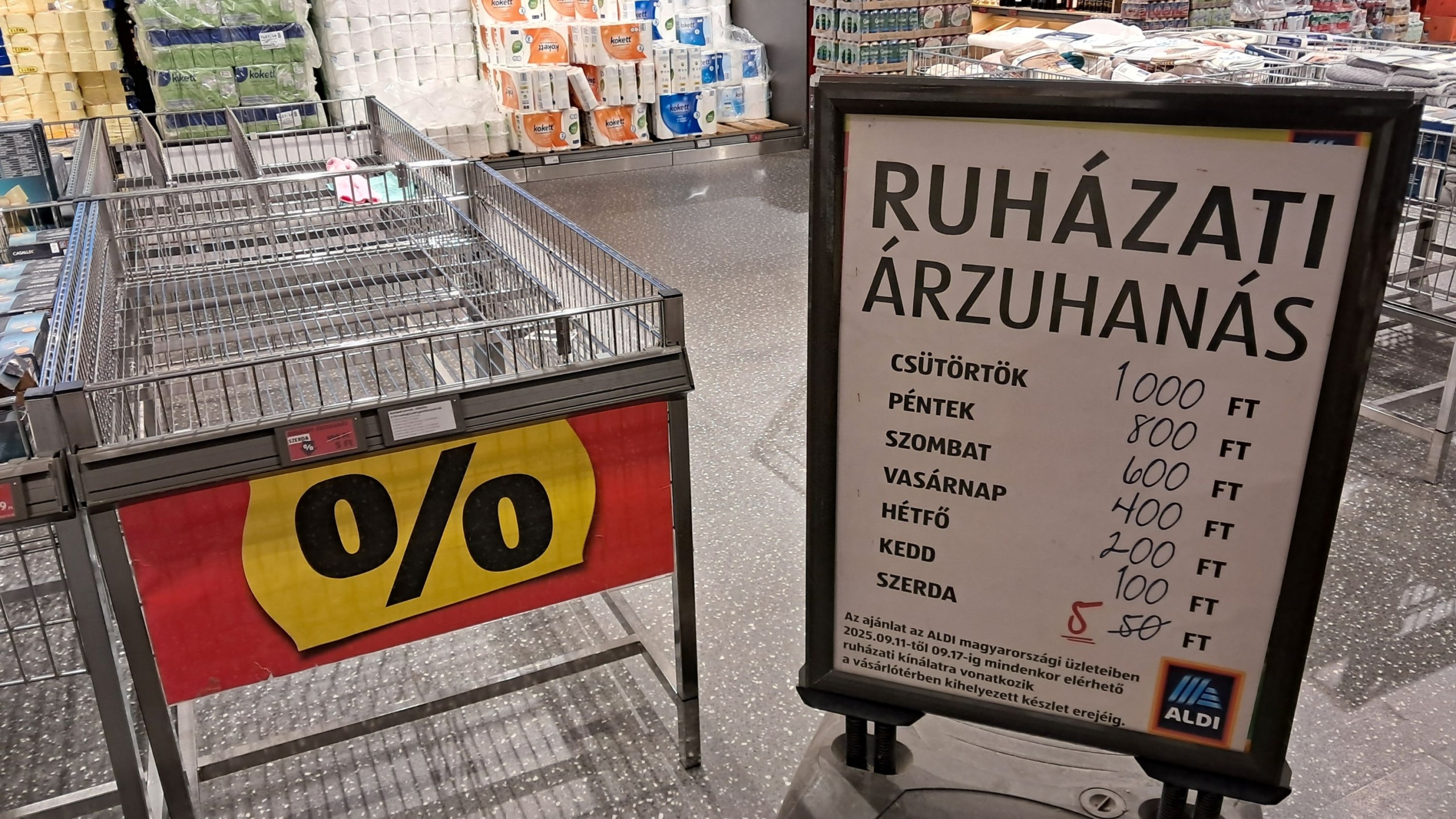 Az Aldiban szeptember 11-től naponta csökkentek a ruházati termékek árai, az első napon 1000 forintért lehetett új ruhát, cipőt vásárolni. Az egyhetes kampány szeptember 17-én, szerdán zárul, amikor 5 forintért vihető haza, ami még megmaradt a készletből. Kollégáink az Aldi Szentendrei úti üzletében hétfőn, a 200 forintos napon jártak, a Váci úti boltban pedig kedden délelőtt néztek körül, amikor is 100 forintért lehetett megvenni az akcióban szereplő termékeket. A látottak alapján ezekben az egységekben már alig maradt választék – ugyanakkor az ország többi Aldi-üzletében ettől eltérő lehet a kínálat a “ruházati árzuhanás” keretén belül.