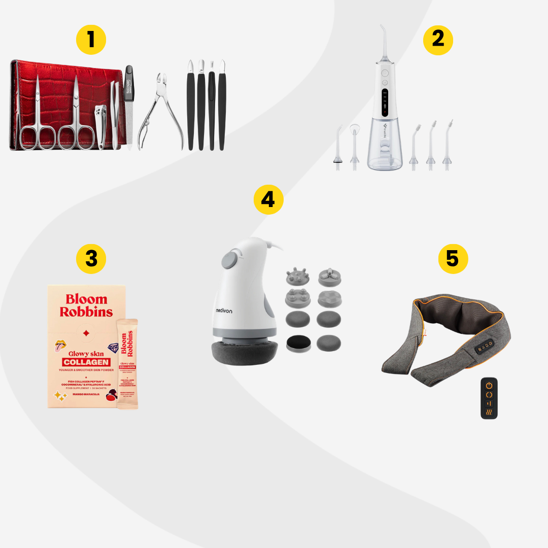 A Bloom Robbins kollagénpor (3) egy könnyen fogyasztható étrend-kiegészítő, amely a bőr rugalmasságának támogatására készült. A TrueLife AquaFloss szájzuhany (2) hatékonyan tisztítja a fogközöket és segít megőrizni az íny egészségét. A relaxációt szolgálja a Medivon masszírozó eszköz (5) , amely segít enyhíteni a napi feszültséget. A szépségápolási rutin része lehet a Dukas manikűr szett (1) használata is, amely professzionális eszközöket kínál otthoni körömápoláshoz. Ha pedig a bőr feszesítése a cél, a Medivon cellulitmasszírozó (4) segíthet a narancsbőr elleni küzdelemben.