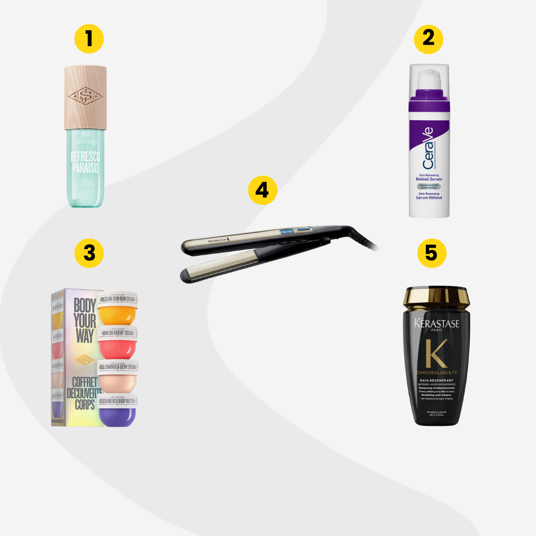 A Sol de Janeiro haj- és testpermet (1) egy egzotikus illatú, könnyű formula, amely egész nap friss érzetet ad a bőrnek és a hajnak. Ha már a hajápolásnál tartunk, a Kérastase Chronologiste regeneráló sampon (5) kifejezetten a meggyengült haj erősítésére és revitalizálására készült. A formázásról a Remington Sleek & Curl hajvasaló (4) gondoskodik, amely egyenesítésre és göndörítésre is használható. A testápolás rajongóinak jó választás a Sol de Janeiro Body Cream Discovery szett (3), amely többféle ikonikus krémet kínál kisebb adagokban. Ha pedig a bőrmegújítás a cél, a CeraVe retinol szérum (2) segít finomítani a bőr textúráját és csökkenteni a ráncok megjelenését.