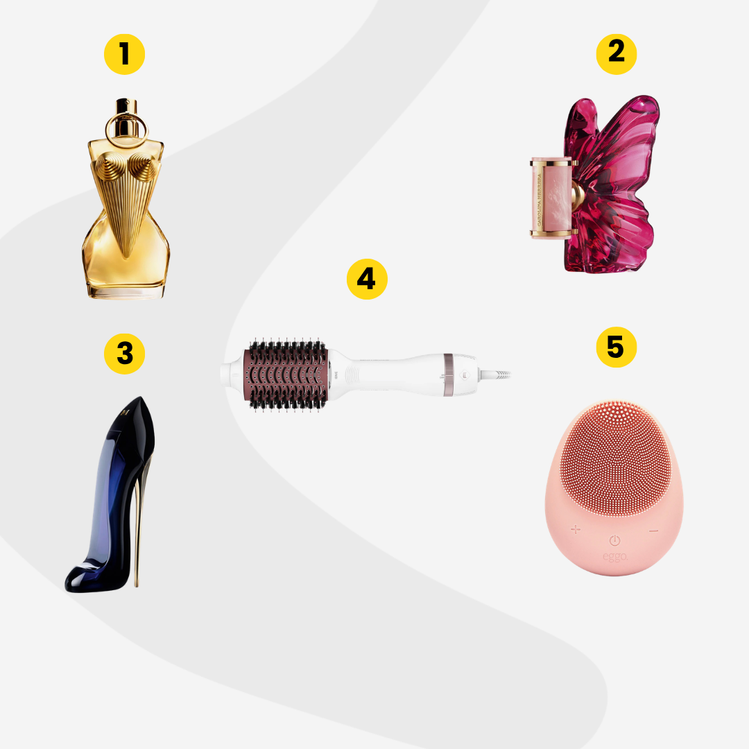 A Carolina Herrera Good Girl parfüm (3) egy ikonikus, elegáns illat, amely egyszerre nőies és karakteres. Ha már parfüm, a Carolina Herrera La Bomba (2) egy újratölthető kivitelű, modern eau de parfum, amely a fenntarthatóságra is nagy hangsúlyt fektet. A különleges kompozíciók kedvelőinek jó választás a Jean Paul Gaultier Divine parfüm (1) is, hiszen intenzív és kifinomult illatélményt kínál. A hajformázás szerelmeseinek a Rowenta meleglevegős hajformázó kefe (4) lehet telitalálat, amely egyszerre szárít és dúsít. A modern bőrápolás egyik eszköze pedig az EGGO szonikus arctisztító készülék (5) amely rezgésekkel segíti a mélytisztítást és a bőr felfrissítését.
