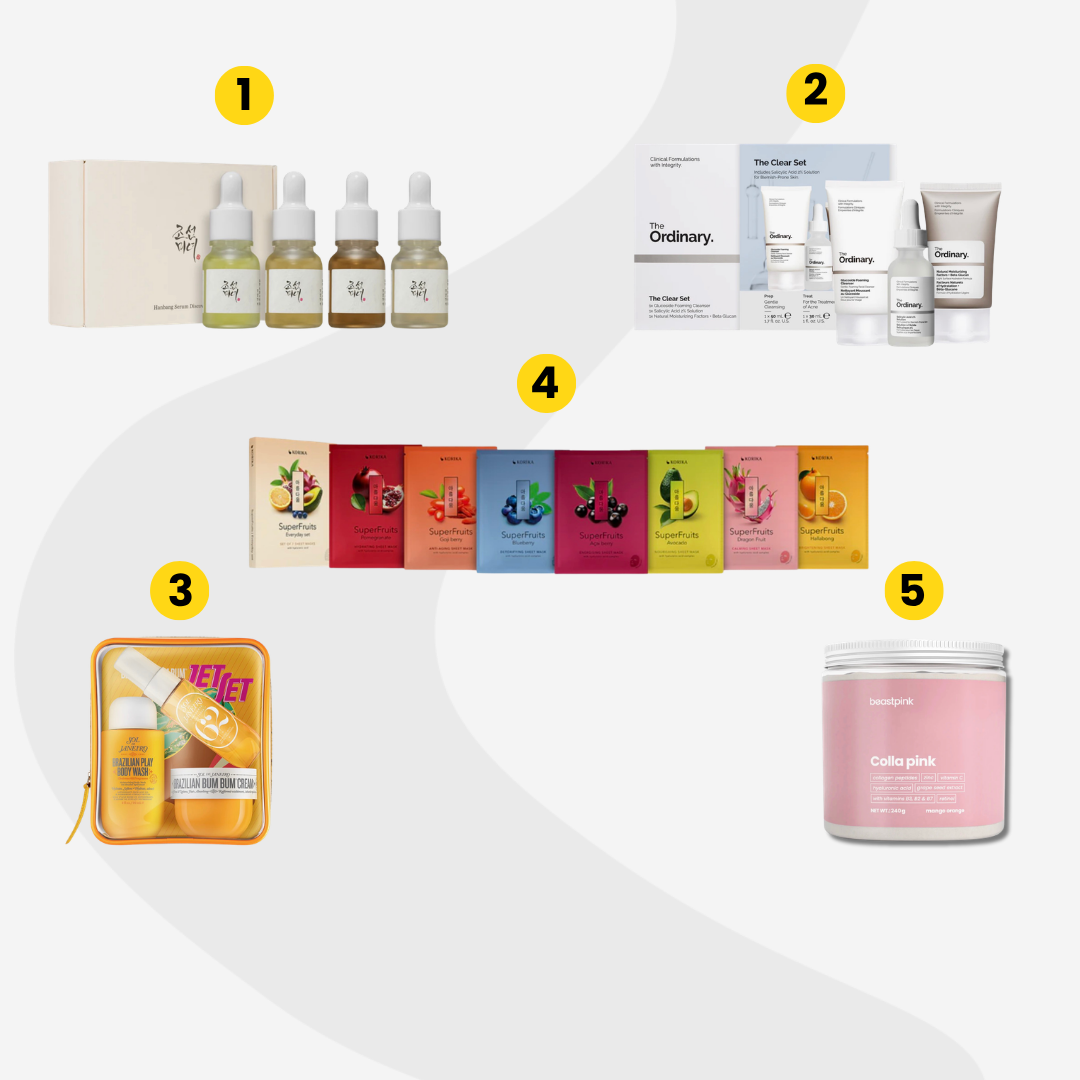 A Beauty of Joseon Hanbang szérum szett (1) egy többféle koreai gyógynövényes szérumot tartalmazó csomag, amely célzottan támogatja a bőr egészségét. Ha már a bőr állapotának javításáról van szó, a The Ordinary The Clear Set (2) egy problémás bőrre összeállított komplett rutin, amely tisztítja a pórusokat és segíti a bőr megújulását. A bőrápolás mellett a belső támogatás sem maradhat ki: a BeastPink Colla Pink kollagénital (5) egy kollagént tartalmazó italpor, amely a bőr és a haj állapotának javítására készült. A kényeztetés vonalát erősíti a Sol de Janeiro Brazilian Bum Bum Jet Set (3) mely ikonikus illatú testápolót, tusfürdőt és permetet kínál praktikus mini kiszerelésben. Ha pedig gyors, látványos frissítésre van szükség, a Korika Superfruits arcmaszk (4) szett hét különböző, antioxidánsokban gazdag fátyolmaszkot tartalmaz.