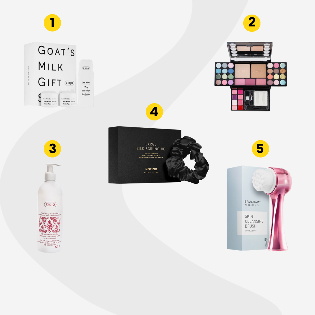 A Zmile Cosmetics Diamonds sminkszett (2) egy kompakt, többféle sminkterméket tartalmazó alapozó- és dekorációs készlet, amely ideális mindennapi használatra vagy utazáshoz. A Ziaja Cashmere testápoló krém (3) könnyű, tápláló formulájával segít puhává és hidratálttá tenni a bőrt. A mindennapi rutin része lehet a BrushArt arctisztító kefe (5) is, amely segít alaposabban eltávolítani a szennyeződéseket és finoman radíroz. Ha inkább egy komplett csomagot adnál, a Ziaja Goat’s Milk kozmetikai szett (1) kecsketejes formulára épül, így kíméletesen hidratál és regenerál. Az elegánsabb vonalat képviseli a Notino Silk Collection selyem hajgumi (4), amely selymes textúrájú így nem károsítja a hajat viselet közben.
