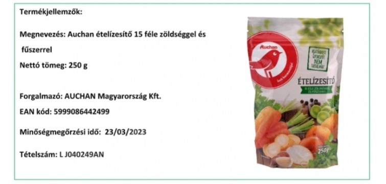 Hatósági kötelezésre, a termék gyártójának értesítése alapján – allergén „zeller” feltételezett jelenléte miatt, amely a termék jelölésén nem került feltüntetésre – a termék forgalmazója, az Auchan Magyarország Kft. visszahívja az alábbi azonosítóval rendelkező „Auchan ételízesítő 15 féle zöldséggel és fűszerrel 250 g” megnevezésű terméket.