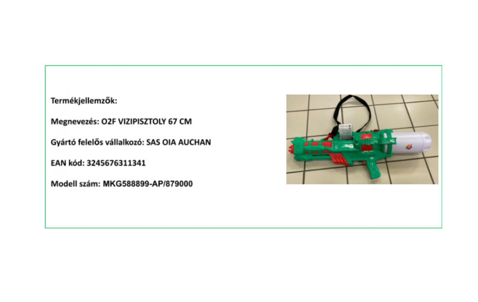 Biztonsági okokból visszahívja a terméket az Auchan, mivel a vízipisztoly tartálya használat közben sérülhet, emiatt balesetveszélyes.