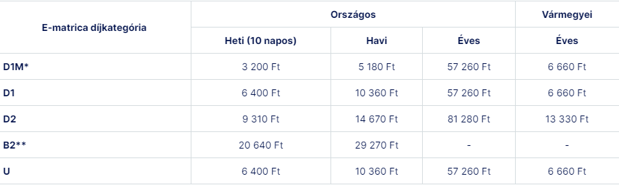 A táblázat alapján a D1-es kategóriában a 10 napos matrica 900 forinttal drágul, a havi 1460 forinttal lesz több, míg az éves matrica ára 8070 forinttal emelkedik. Nincs ugyanakkor még hivatalos tájékoztatás az egynapos matrica áráról, pedig egy uniós határozat miatt 2024 március végétől kötelező lesz azt is árusítani.