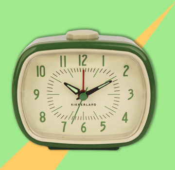 Ez a zöld Kikkerland ébresztőóra nem rendkívüli képességeivel, hanem retró stílusával tűnik ki. Folyamatosan mozgásban lévő másodpercmutatójának köszönhetően visszarepít az időben, de így sincs menekvés a korán kelés elől, mert mindig pontosan ébreszt!