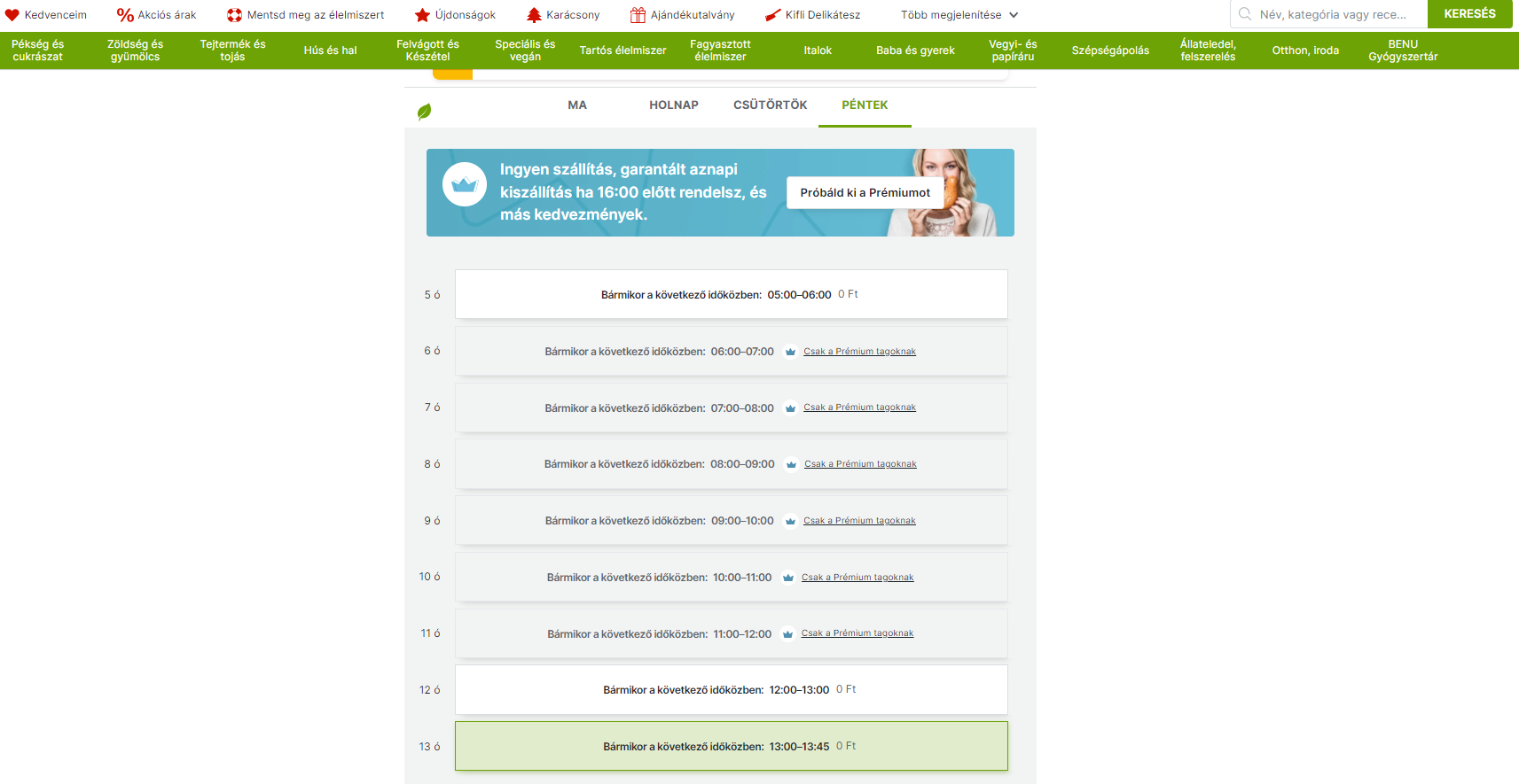 A kifli.hu az ünnepekre készülve december 13-tól korlátozza, hogy egyszerre hány különböző terméket tudnak a vevők vásárolni egy rendelésben, emellett karácsonyig átmenetileg megszűnik a 15 perces időablak, az expressz kiszállítás és a vásárlás kiegészítésére legkésőbb 12 órával a kiszállítás megkezdése előtt van lehetőség. Érdemes-e rendelést leadni? Ha prémium tag vagy, akkor igen. December 22-én és 23-án ugyanis a prémium tagokra bőséggel várnak szabad időpontok, december 24-én pedig 13 óráig szállítanak ki házhoz – ez utóbbi napon egy-két időpont elérhető nem prémium tagoknak is.