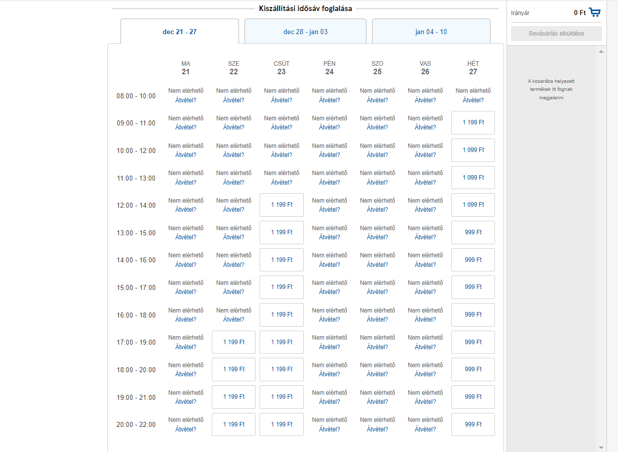 Egy budapesti belvárosi címmel keresve jól látszik, még jócskán akadnak karácsony előtti időpontok a Tesco Otthonról esetében, a két ünnep közötti időszakra viszont a fentinél azért jóval több időpont közül lehet válogatni. A karácsony előtti két napra, 22-re és 23-ra még lehet foglalni idősávot személyes átvételre több üzletben is. Ami a Tesco Dobozt illeti, már korábban is arra kérték a vásárlókat, hogy 2021. december 16-ig adják le a rendelést, hogy bevásárlását még az ünnepek előtt ki tudják szállítani, ezt követően megnövekedett kézbesítési idő várható. Ez az idő eltelt, azóta pedig több városban is megtelt a kapacitás.
