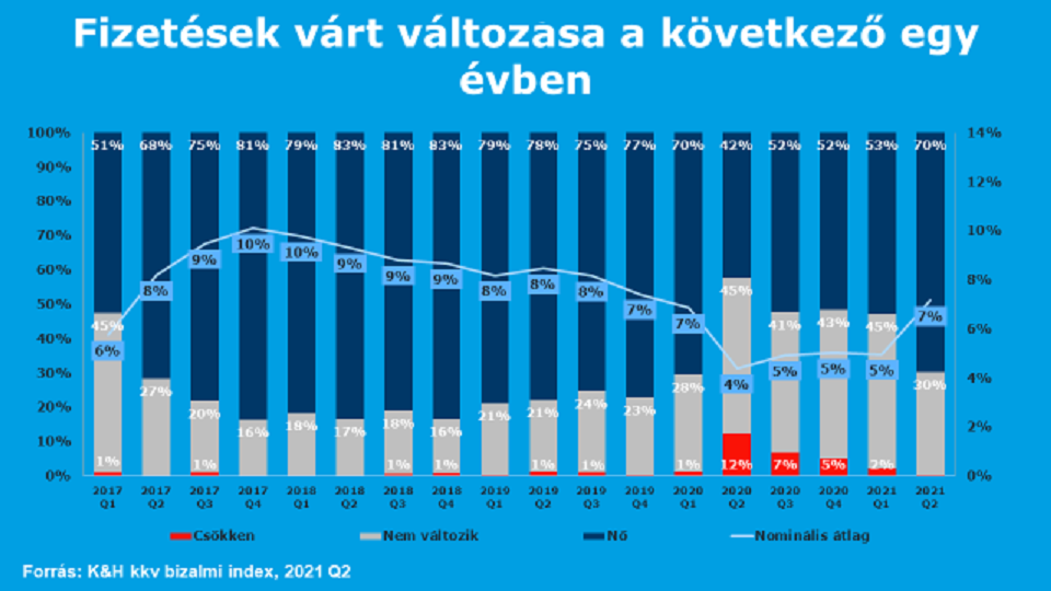 Fizetésemelésre és több béren kívüli juttatásra számíthatnak a mikro-, kis- és középvállalkozásoknál dolgozók a cégek következő egy évre vonatkozó várakozásait és terveit vizsgáló K&H kkv bizalmi index kutatás második negyedéves eredményei szerint. A szektor átlagosan 7 százalékos fizetésemelésre készül, amely megegyezik a tavaly év eleji, azaz a járvány előtti tervekkel, de egyelőre elmarad a 3-4 évvel ezelőtti 8-10 százalékos fizetésemelési szándéktól. Jelenleg 10-ből 7 vállalkozás gondolja úgy, hogy a kkv-k körében növekedni fognak a keresetek, és senki nem számít csökkenésre – derült ki a K&H kutatásából.