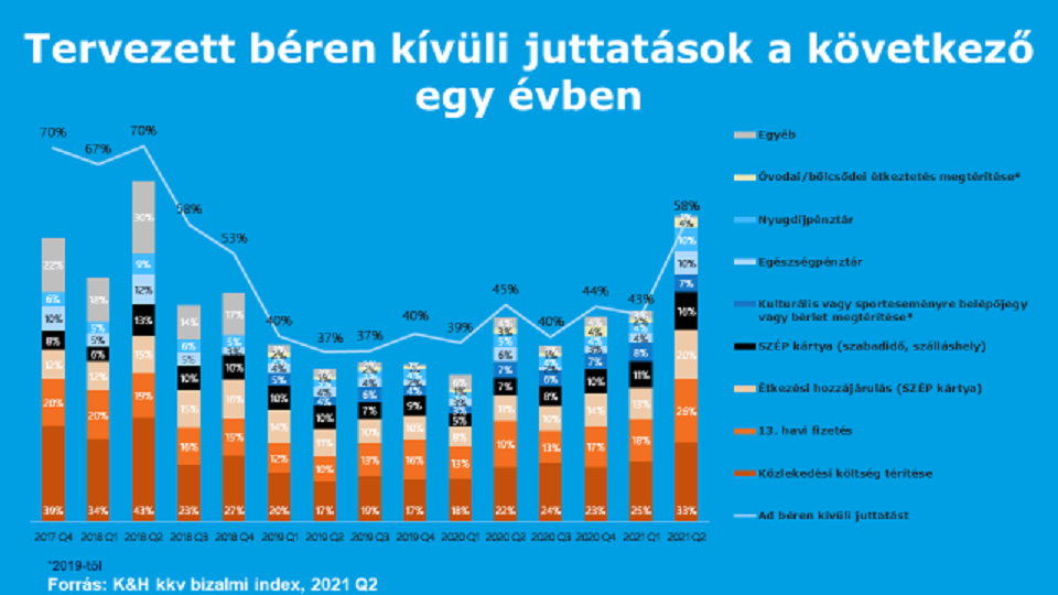 A béren kívüli juttatásokat tekintve még pozitívabbak a kkv-nál dolgozók kilátásai. A vállalkozások 58 százaléka tervezi a fizetésen túl is támogatni munkavállalóit valamilyen formában. Ez jelentősen meghaladja az elmúlt több mint két évben jellemző 40 százalék körüli értéket, utoljára 2018-ban volt ezen a szinten. Az elmúlt negyedévhez képest a legnagyobb ugrás a SZÉP kártyánál figyelhető meg, 24-ről 36 százalékra ugrott az ilyen juttatással tervező vállalkozások aránya. Emellett az egészségpénztári- és a nyugdíjpénztári kedvezményeknél is komolyabb emelkedés látható: 4-ről 10 százalékra nőtt az ebben gondolkodó cégek aránya.
