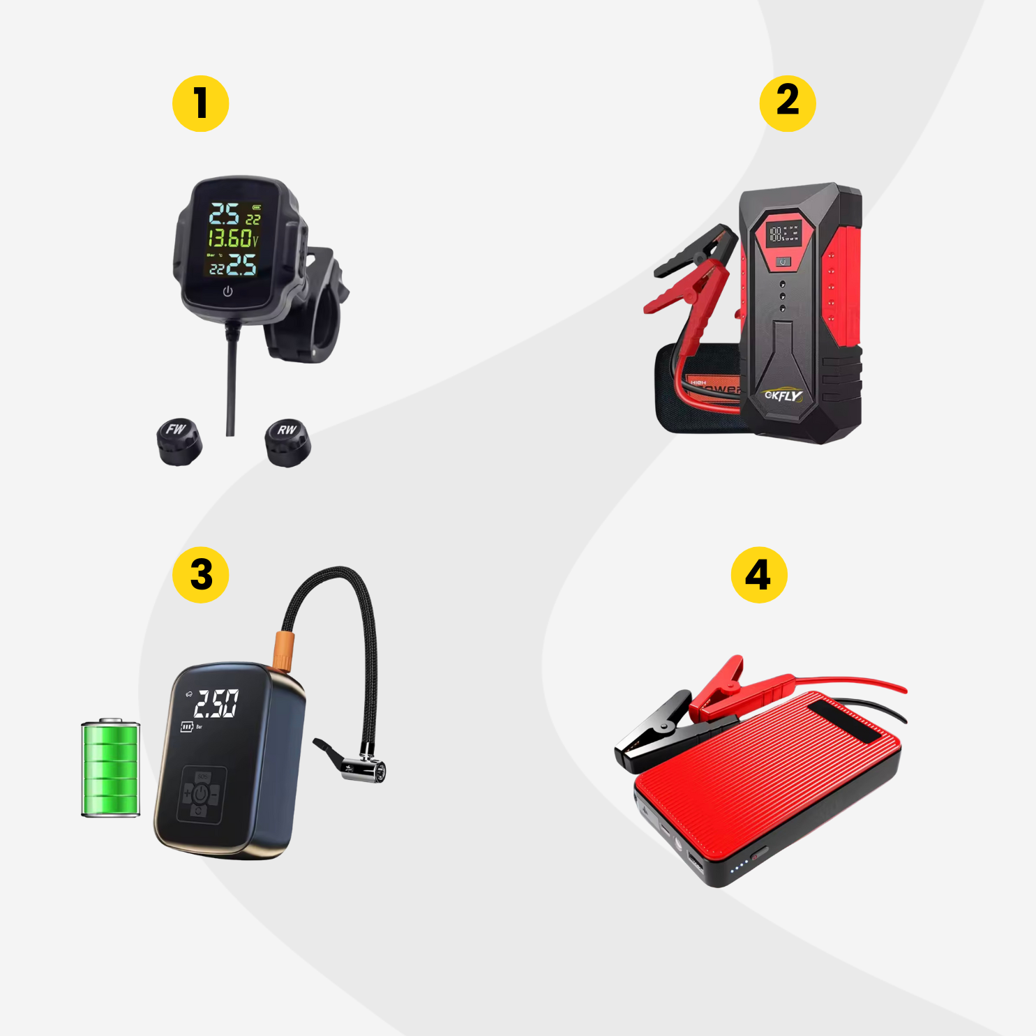 Problémák esetén a legtöbben autószerelőhöz fordulnak: vannak azonban olyan helyzetek, amelyeket bizonyos segédeszközökkel otthoni körülmények mellett is megoldhatunk. Ez a guminyomásmérő (1) például segít abban, hogy felmérjük autógumijaink állapotát, ha pedig egy kis extra levegőre van szükség a gumikban, ez az elektromos pumpa (3) remek választás.