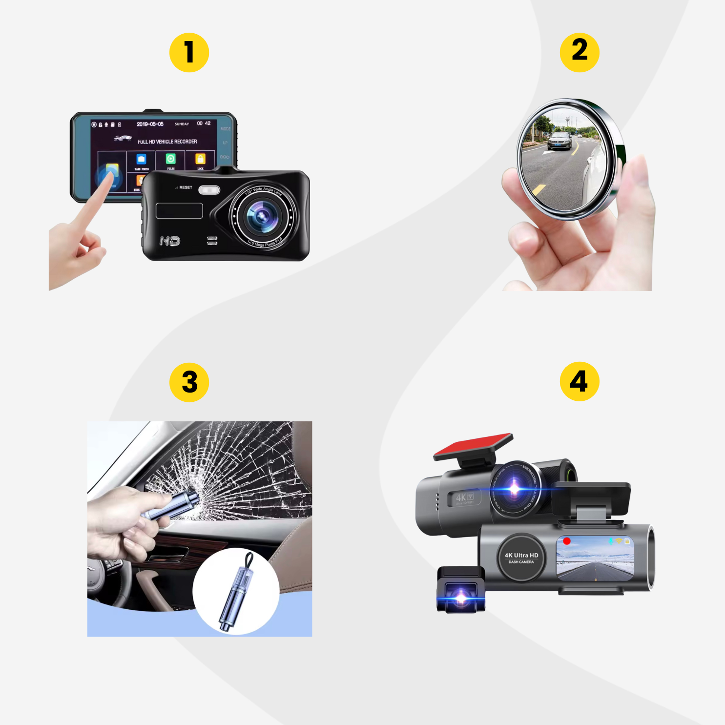 Vezetés közben a legfőbb a biztonság: ez a kiegészítő tükör (2) segít abban, hogy a holtteret is láthassuk. Ha pedig mégis kétes helyzetbe keverednénk, ez az olcsó, vízálló első-hátsó kamera (1) segít visszanézni, mi is történt pontosan. Ha nagyobb felbontású, prémiumabb terméket keresünk, ezt a 4K felbontású kamerát (4) ajánljuk, ami éjszaka is remekül működik.