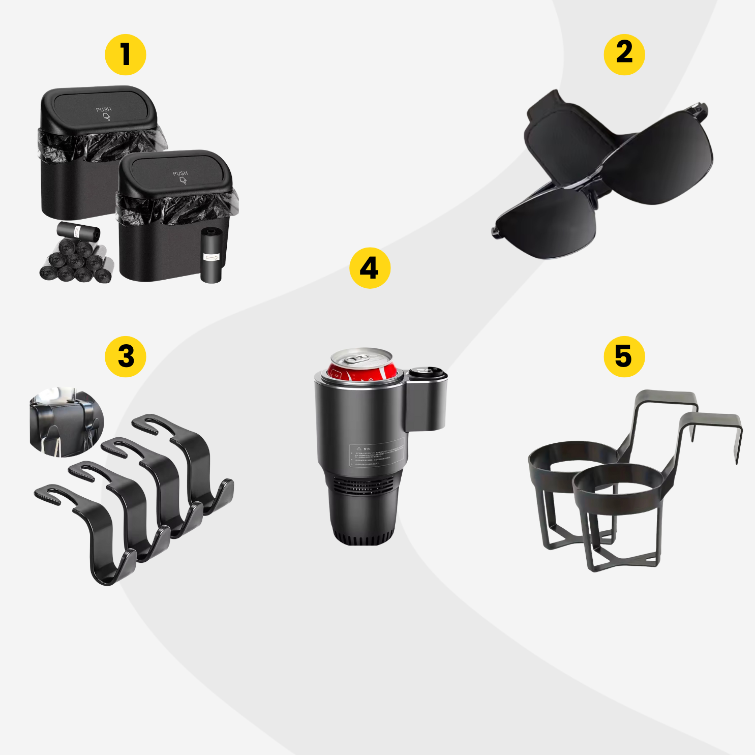 A legjobb, ha autónkban rendelkezésre áll egy-két akasztó is, melyeket sokféle módon felhasználhatunk: ilyenek ezek az ülésre szerelhető, egyszerű kampók (3), melyeken ruhadarabok és táskák egyaránt elférnek. A legnagyobb kényelem érdekében pedig válasszuk ezt a prémium italtartót (4), amely a belehelyezett italok hűtésére és melegítésére is képes.