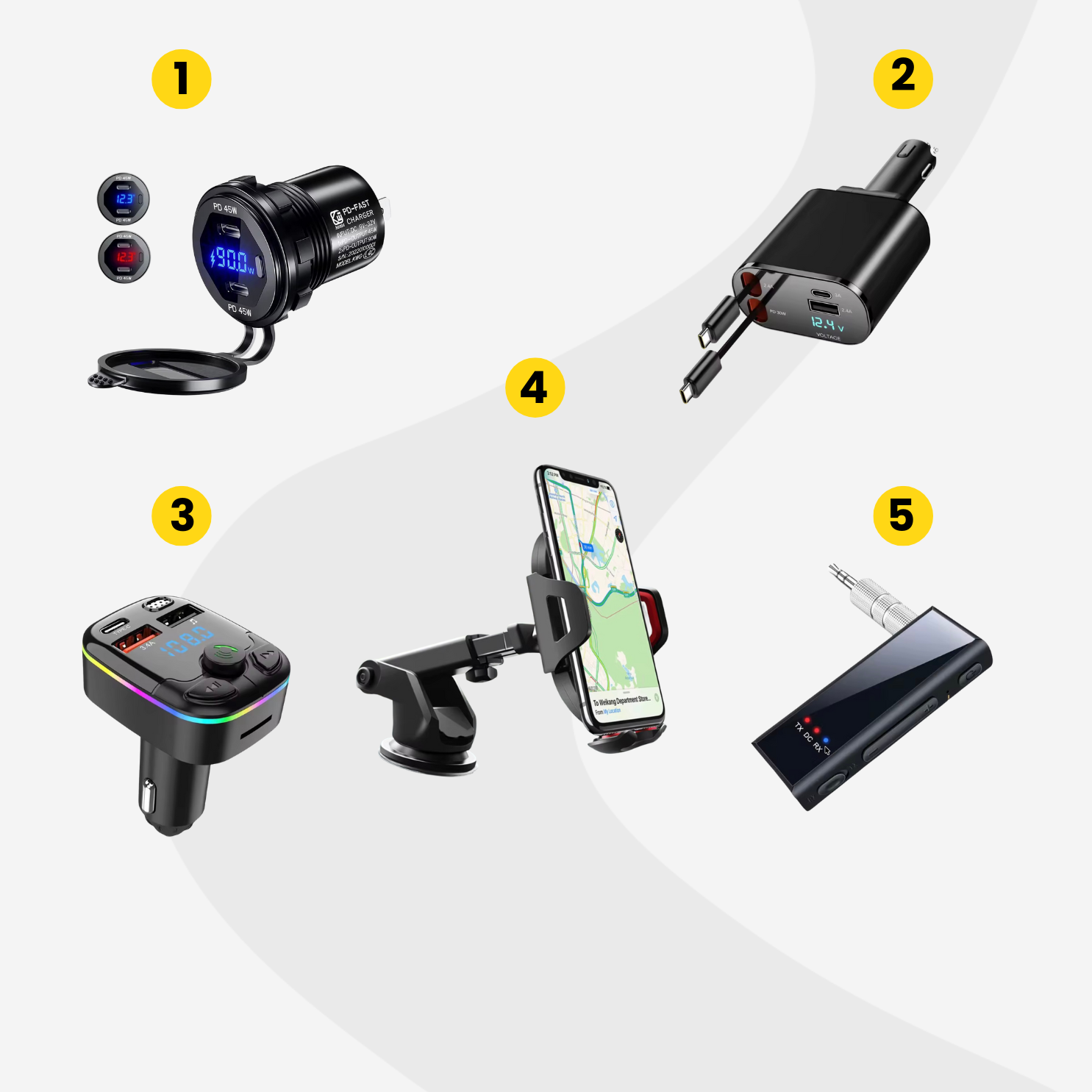 Az autózás közbeni telefonhasználat sokak szerint nem biztonságos, azonban, ha megfelelő körülményeket teremtünk, a telefon remek támogatást nyújthat a vezetés során. Ezzel a gyorstöltővel (1) biztosíthatjuk, hogy telefonunk akár egy rövid út alatt is teljesen feltöltődjön, ezzel a kihúzható kábeles töltővel (2) pedig amiatt sem kell aggódnunk, hogy otthon felejtjük a töltőkábelt. Ezzel a szélvédőre pattintható telefontartóval (4) pedig biztosíthatjuk, hogy navigáció során megfelelően rálássunk a térképre.