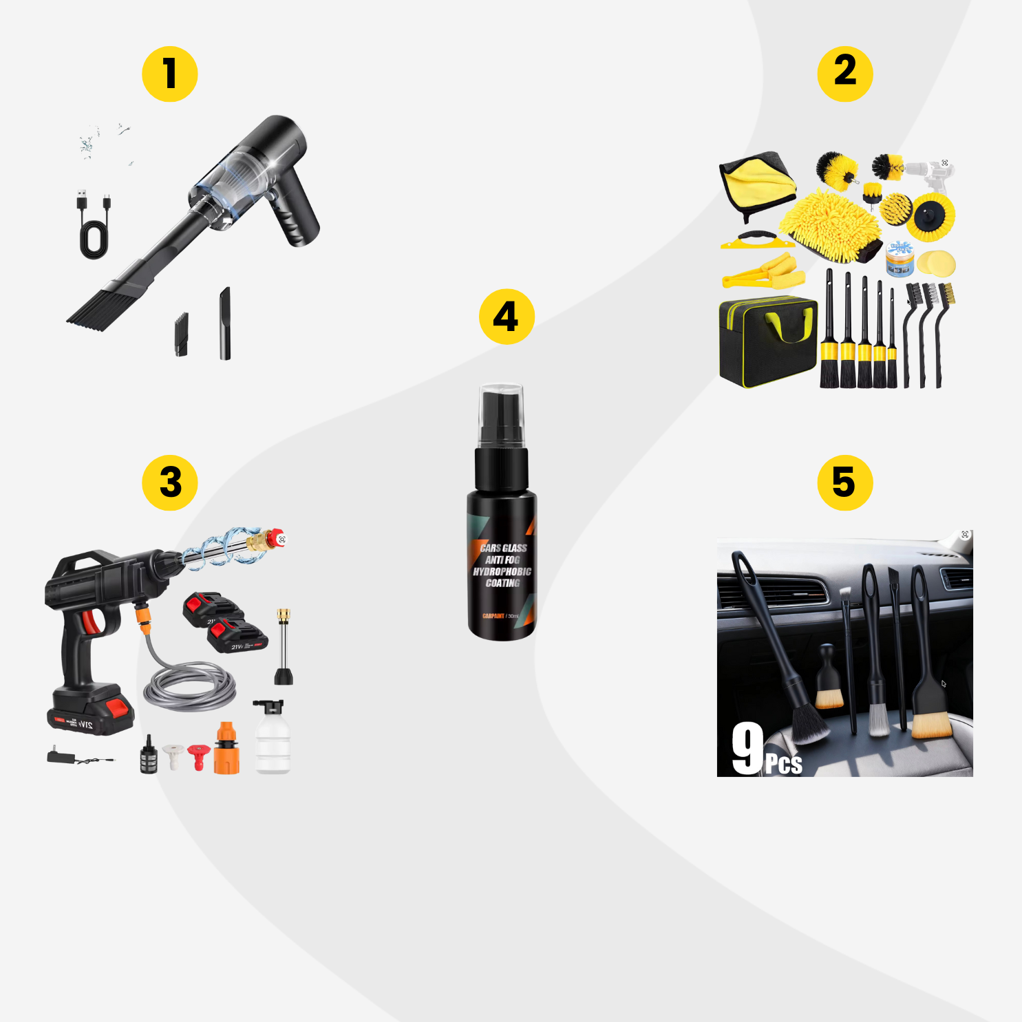 Autónk tisztasága a kényelem és a biztonság szempontjából is egyaránt fontos: ha nincsenek otthon speciális tisztítóeszközeink, érdemes elsőként ezt a szettet (2) beszerezni, melyben megtalálható mindenféle rongy és szivacs, amelyek hasznosak lehetnek autónk karbantartásában. A visszapillantótükrök tisztán tartása kiemelten fontos a biztonság érdekében, így ez a kompakt, könnyen használható tisztító spray (4) szintén alapdarabnak számít. Ha pedig autónknak komolyabb tisztításra lenne szüksége, válasszuk ezt a magasnyomású tisztítót (3), amely a legmakacsabb szennyeződéseket is hatékonyan távolítja el.