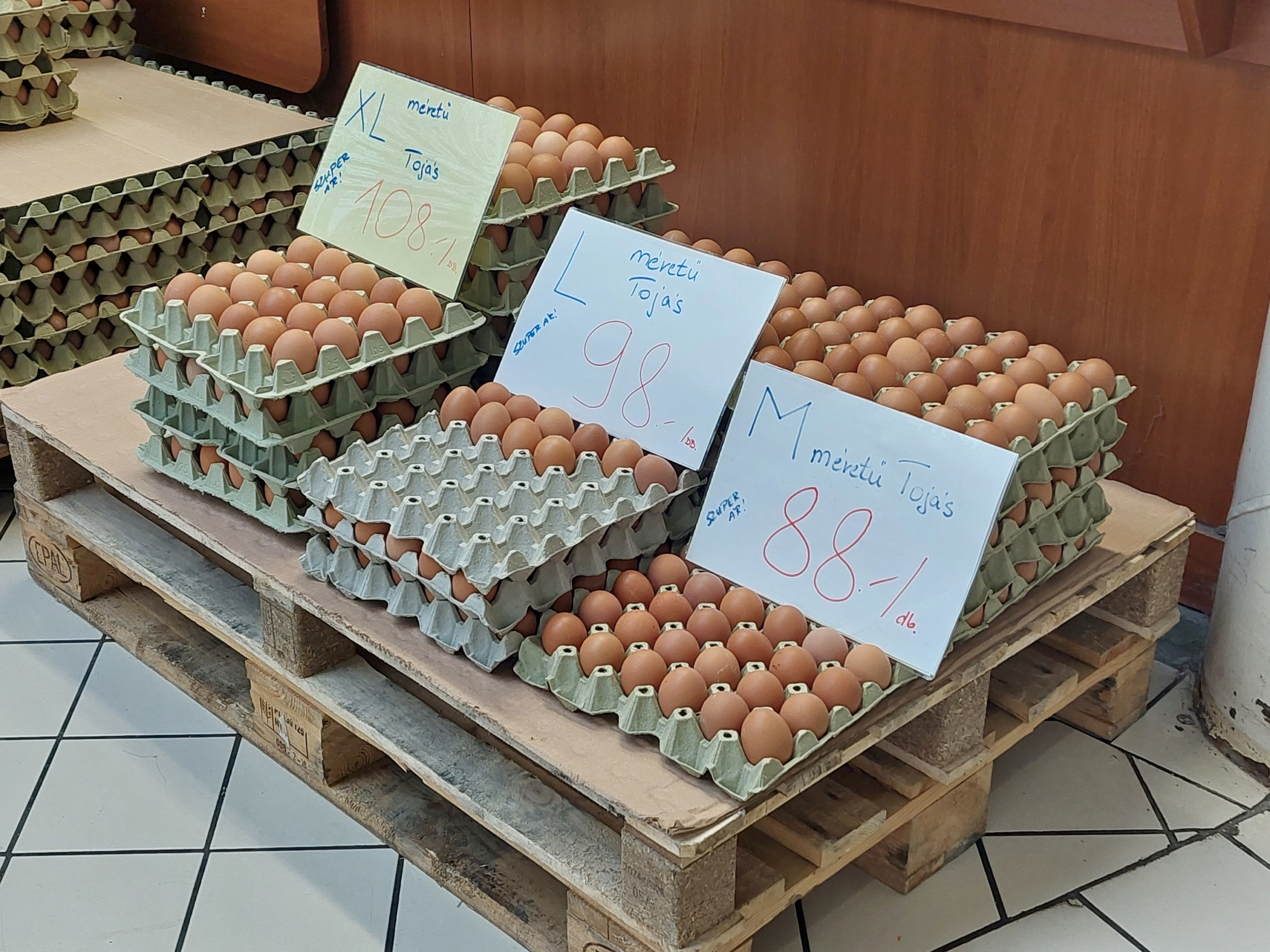 az M-es tojás 88 forint, de az L-es már 98 és 104, az XL-es 108 és 120 forint között mozog.